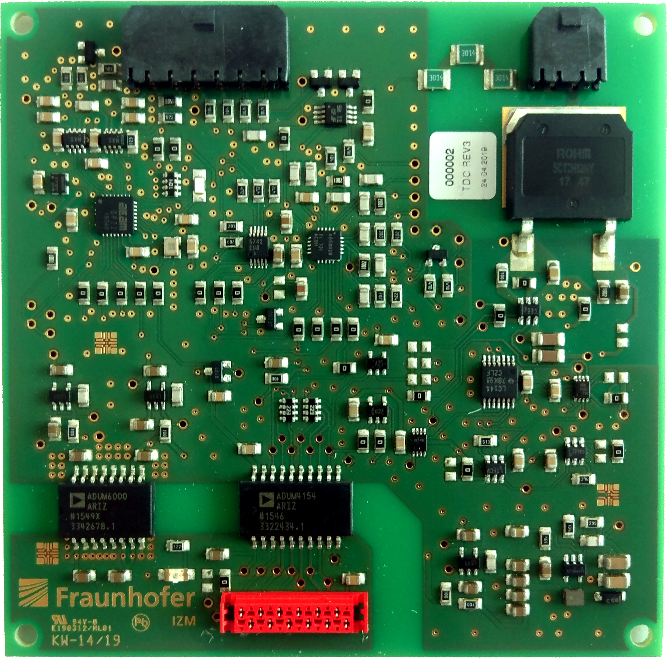 The AMWind project produced a concept and developed a component that tracks the state of the power modules by monitoring certain electrical parameters affected by temperatures. This allows a precise forecast of the remaining working life of the power elec-tronics of wind farms in active offshore use. Targeted state monitoring of this nature can help predict or prevent breakdowns in the field. Preemptive concepts like this are already the established standard for other critical components like transmissions or bearings, but the integrated power electronics as yet lack reliable means for monitoring the technology as it ages. An 8 x 8 cm board is integrated directly in the offshore wind turbine’s power module and surveys several characteristic properties that vary with minute changes in power dissipation, revealing the thermal effects at work on site. It does so by analyzing certain temperature-dependent electrical signals: the so-called Miller plateau, which determines the time between different voltages during switching. The hardware developed by Fraunhofer IZM records the data with micro-second accuracy to calculate the actual temperature at the module.