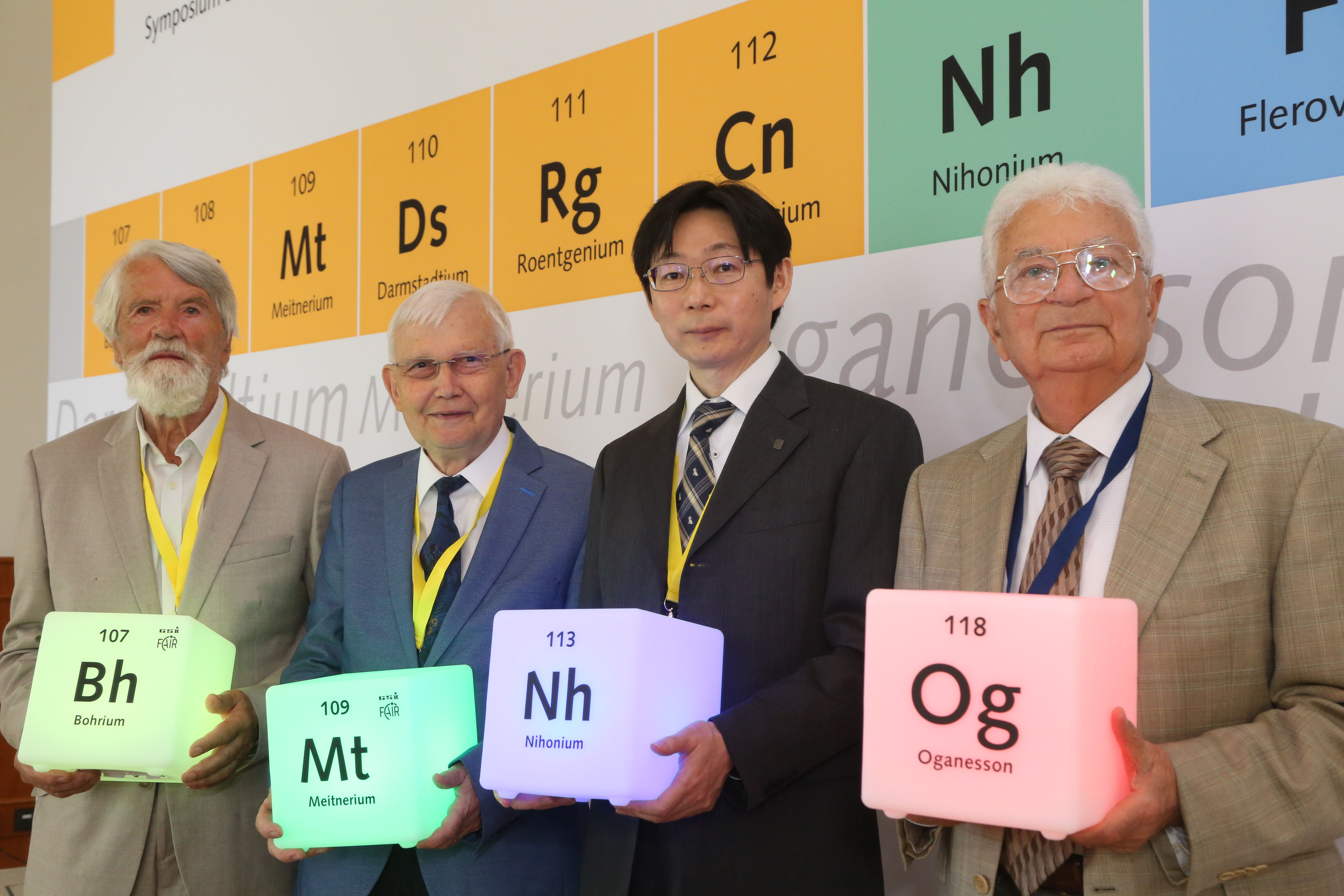 Professors Peter Armbruster and Gottfried Münzenberg, who held leading positions in the production of elements 107 to 112 (bohrium, hassium, meitnerium, darmstadtium, roentgenium and copernicium) at the GSI Helmhotzzentrum during their active research careers, are present at the conference. Professor Yuri Oganessian is also on site. He is an element discoverer from Russia and currently the only living person an element is named after: element 118, Oganesson. He was head of the discovery team of Elements 114 to 118 (flerovium, moscovium, livermorium, tennessine and oganesson) at the Flerov Laboratory of the Joint Institute for Nuclear Research, JINR in Dubna, Russia. Dr. Kouji Morimoto from Japan of the RIKEN Nishina Center for Accelerator-Based Science, who was a member of the element 113 discovery team, attends as well. The current heads of GSI, the Flerov Laboratory and the RIKEN Nishina Center, where the respective elements were discovered, also participate in the conference.