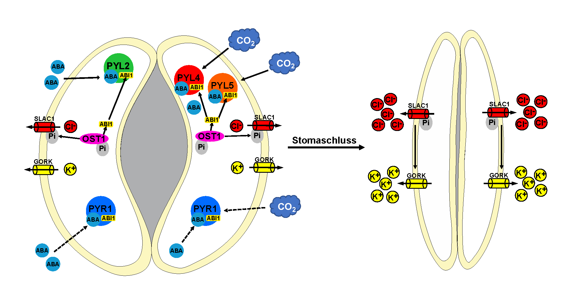 The two experts found out that the gene expression patterns differed significantly at high CO2 or ABA concentrations. Moreover, they noticed that excessive CO2 also caused the expression of some ABA genes to change. These findings led the researchers to take a closer look at the ABA signalling pathway. They were particularly interested in the ABA receptors of the PYR/PYL family (pyrabactin receptor and pyrabactin-like). Arabidopsis has 14 of these receptors, six of them in the guard cells.
