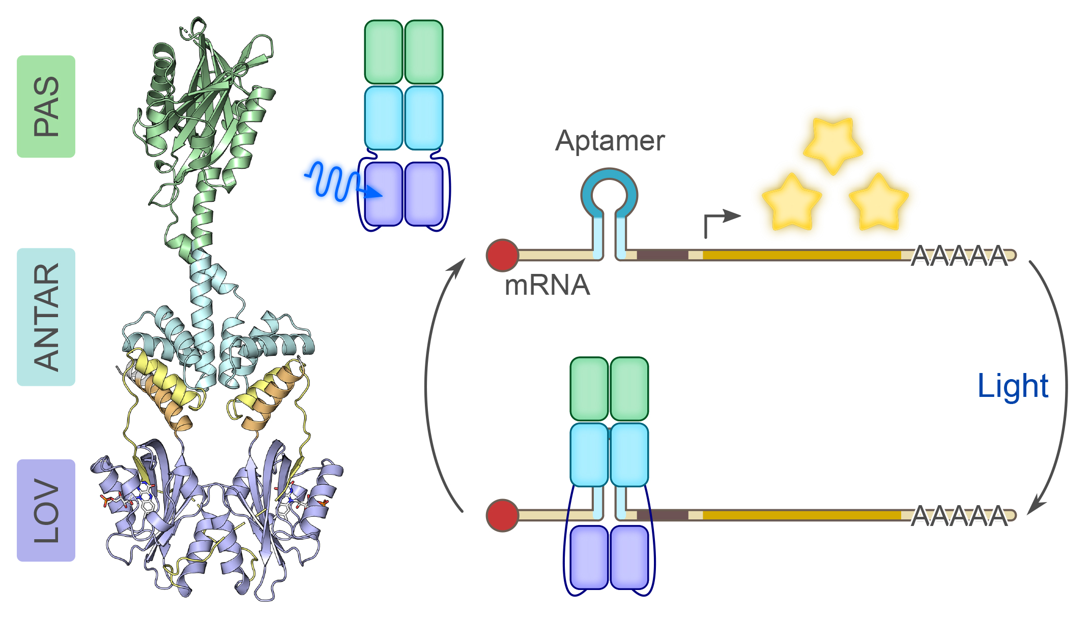 Erst wenn die Blaulicht-Bestrahlung endet und die ANTAR-Domäne wieder in ihre normale Struktur zurückfällt, löst sich die Interaktion mit der RNA. Jetzt wird die RNA wieder aktiv. Die Forscher haben diesen Vorgang zunächst am Beispiel der RNA-Aptameren etabliert und nachgewiesen. Diese sind kleine RNA-Moleküle mit einer haarnadelähnlichen Struktur, die in die unter Blaulicht geöffnete Struktur der ANTAR-Domäne eindringen können und hier gebunden werden. Mayer: „Aptamere funktionieren modular: Sie lassen sich wie mit einem Baukastensystem an andere Einheiten binden.“