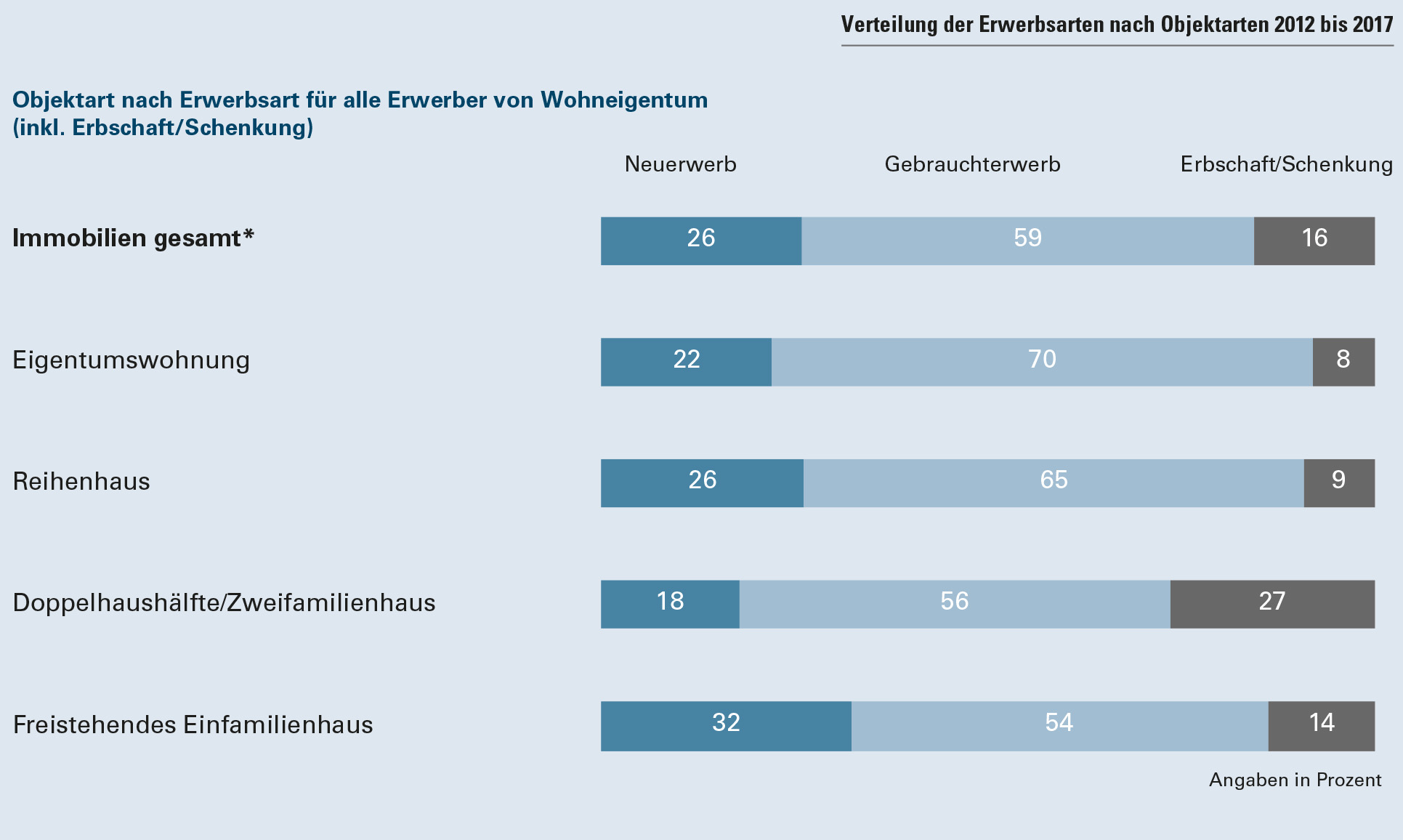 Drei Viertel der befragten Haushalte bildeten der Erhebung zufolge selbstgenutztes Wohneigentum in Häusern, wobei die meisten das klassische Einfamilienhaus bevorzugten. Lediglich ein Fünftel der Haushalte kaufte eine Eigentumswohnung.