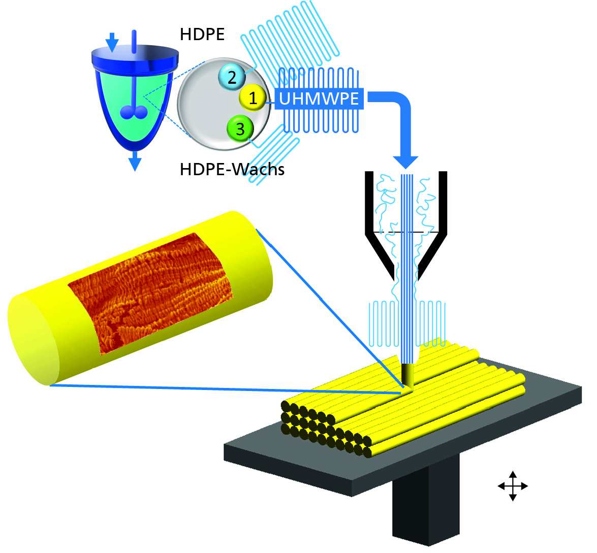 Jedoch können aus regulärem PE bis heute keine tragfähigen Bauteile hergestellt werden, da es als Werkstoff nicht widerstandsfähig genug ist. Zur Verstärkung werden bisher Füllstoffe genutzt, besonders Kohlenstoff- oder Glasfasern. Dabei verschlechtert sich die Energie-, Rohstoff-, Umwelt- und Kostenbilanz dramatisch: Die Herstellung sowie das Recycling sind erheblich erschwert und kostspielig. Eine Alternative bietet sogenanntes ultrahochmolekulares PE (UHMWPE), das als Hochleistungswerkstoff beispielsweise in medizinischen Implantaten wie Hüftpfannen oder Kniegelenken verwendet wird. Dieser sortenreine, hochfeste und abriebbeständige Werkstoff lässt sich jedoch nicht im Spritzguss verarbeiten: Er muss aufwändig und kostenintensiv als Pulver in eine Form gepresst, gesintert und danach zum exakten Bauteil gefräst werden. Fasern aus UHMWPE können zwar die Festigkeit von Stahl erreichen, sind jedoch teuer und für ein Werkstoffrecycling ungeeignet.
