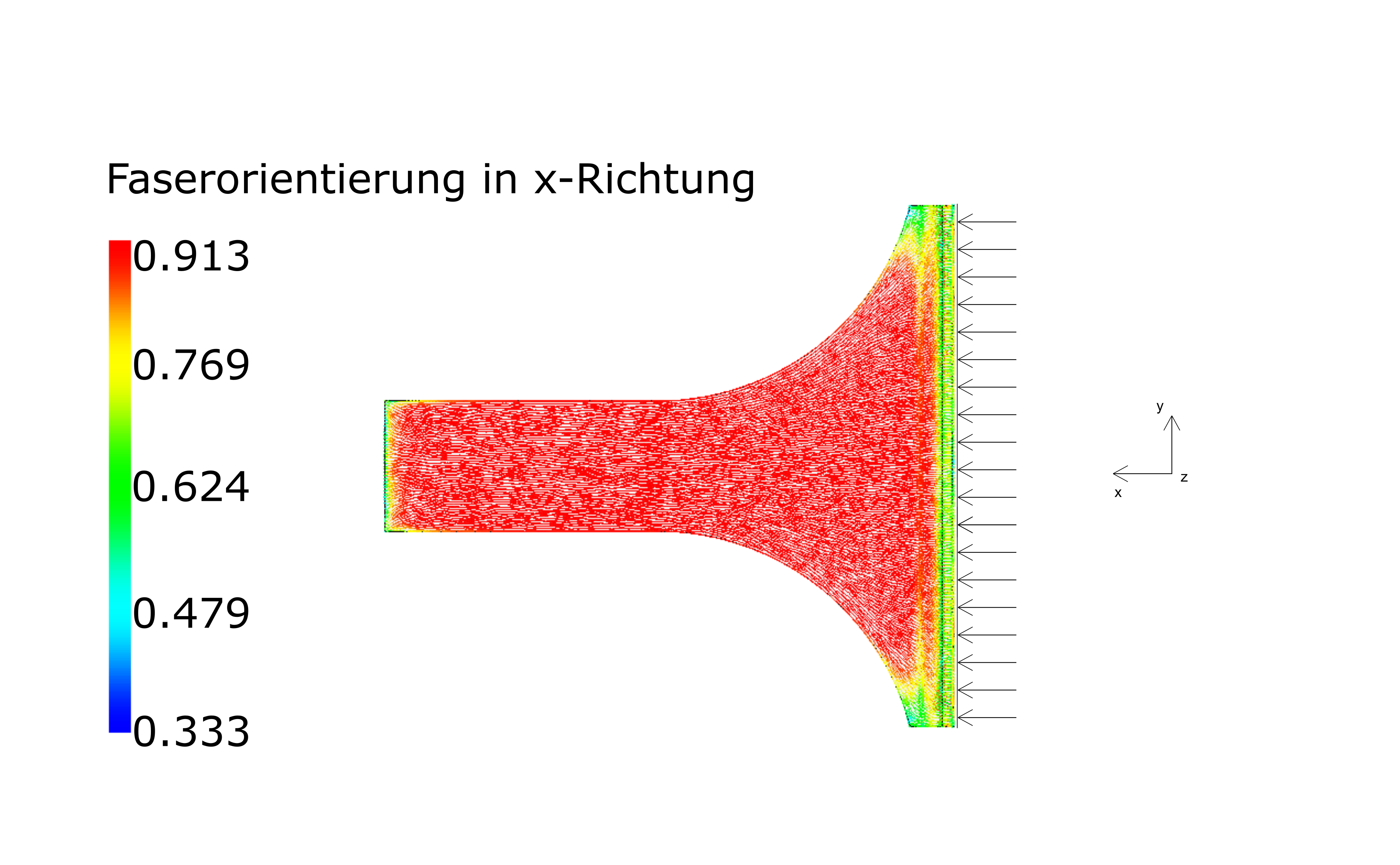 Allgemein bilden sich bei plattenförmigen Bauteilen im Spritzgussprozess mit faserverstärkten Materialien zwei Randschichten (Orientierung in Fließrichtung) und eine Mittelschicht (Orientierung quer zur Fließrichtung) über die Plattendicke. Diese unterschiedlichen Orientierungen erschweren den Auslegungsprozess.