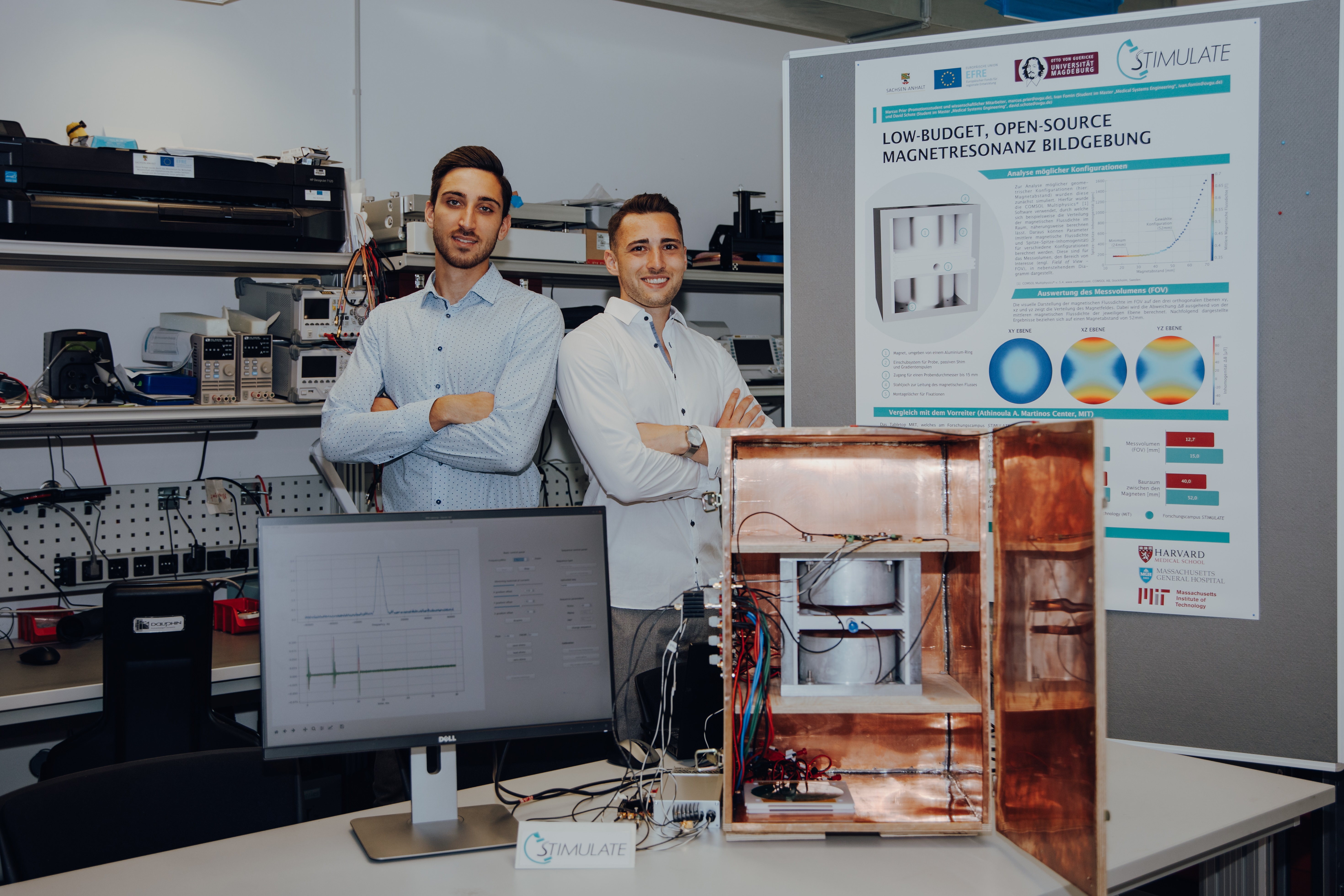 „Die Herausforderung bei der Entwicklung des Tisch-MRT bestand für uns darin, zwei extrem starke Permanentmagnete, die sich gegenseitig mit 1,2 Tonnen anziehen, in einer Trägerkonstruktion auf einem Abstand von nur wenigen Zentimetern zu halten und so zu fixieren“, erläutert Marcus Prier, der als Wissenschaftlicher Mitarbeiter am medizintechnischen Forschungscampus STIMULATE arbeitet. Die komplizierte Elektronik, die für die Inbetriebnahme des Prototypen erforderlich war, wurde in einem der 11 Gründerlabore der Universität Magdeburg, dem FLEXtronic Labor, eigenständig entwickelt und gefertigt.