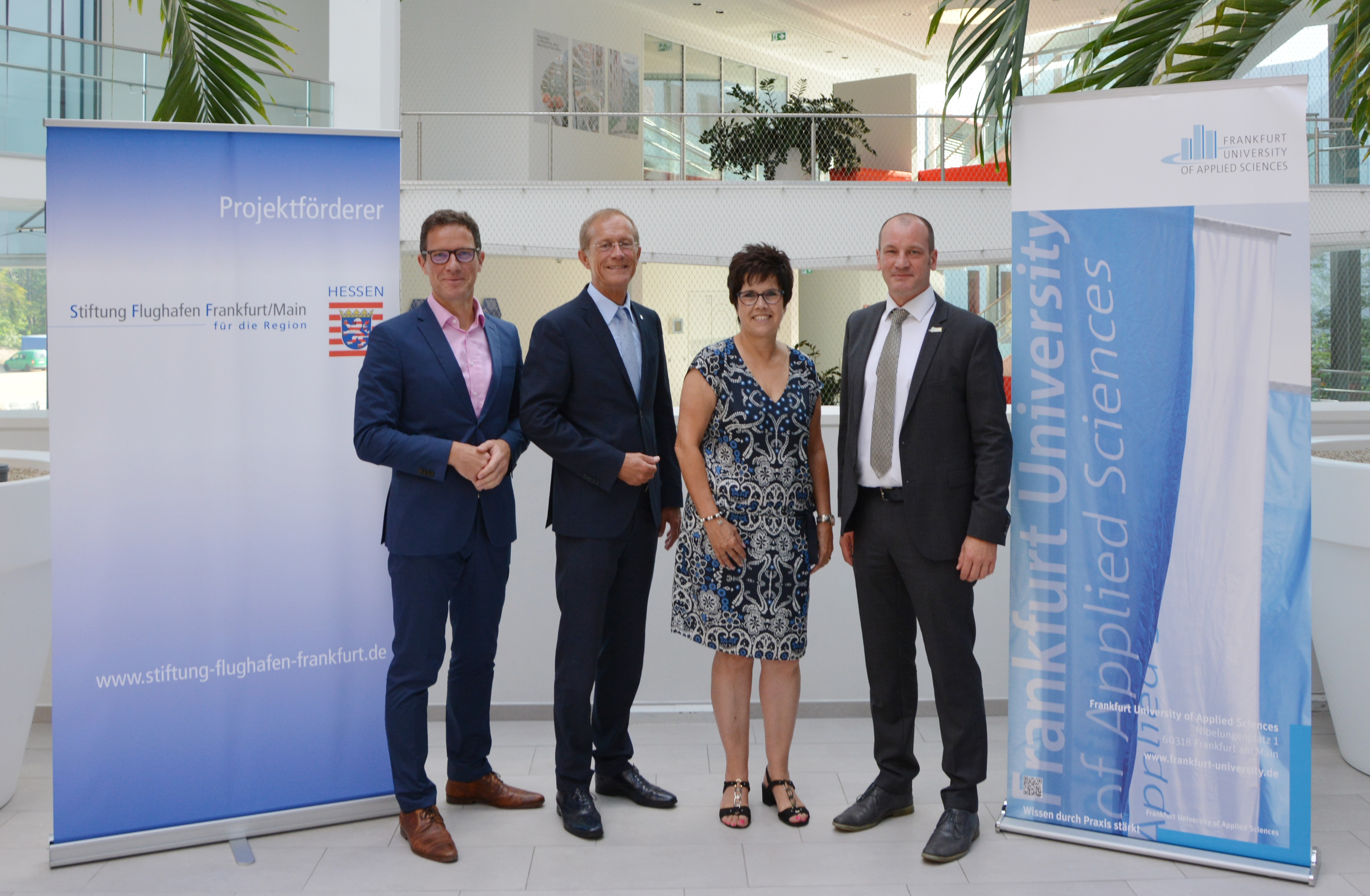 Bildunterschrift: Stiftung Flughafen Frankfurt/Main unterstützt die „European Summer University in Global Logistics“ (v.l.n.r.): Prof. Dr. Kai-Oliver Schocke, Studiengangsleiter Global Logistics (M.Sc.) der Frankfurt UAS, Axel Wintermeyer, Staatsminister und Vorstandsmitglied der Stiftung Flughafen Frankfurt/Main, Jutta Nothacker, Geschäftsführerin der Stiftung, Prof. Dr.-Ing. René Thiele, Vizepräsident der Frankfurt UAS.