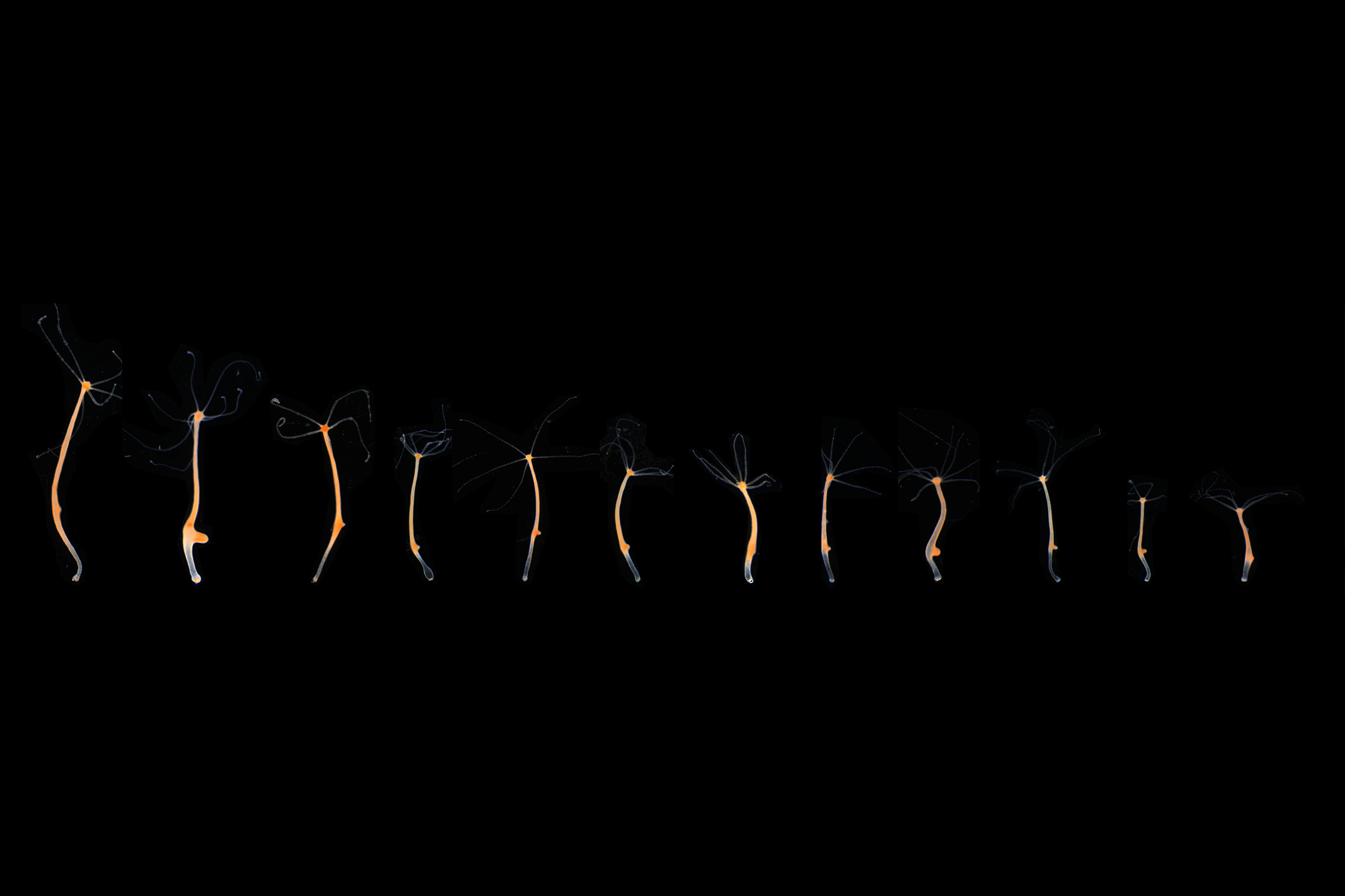 Bildunterschrift: Einige Exemplare des Süßwasserpolypen Hydra, die den Einfluss von Umweltfaktoren und interner Regulierung auf das Größenwachstum verdeutlichen.