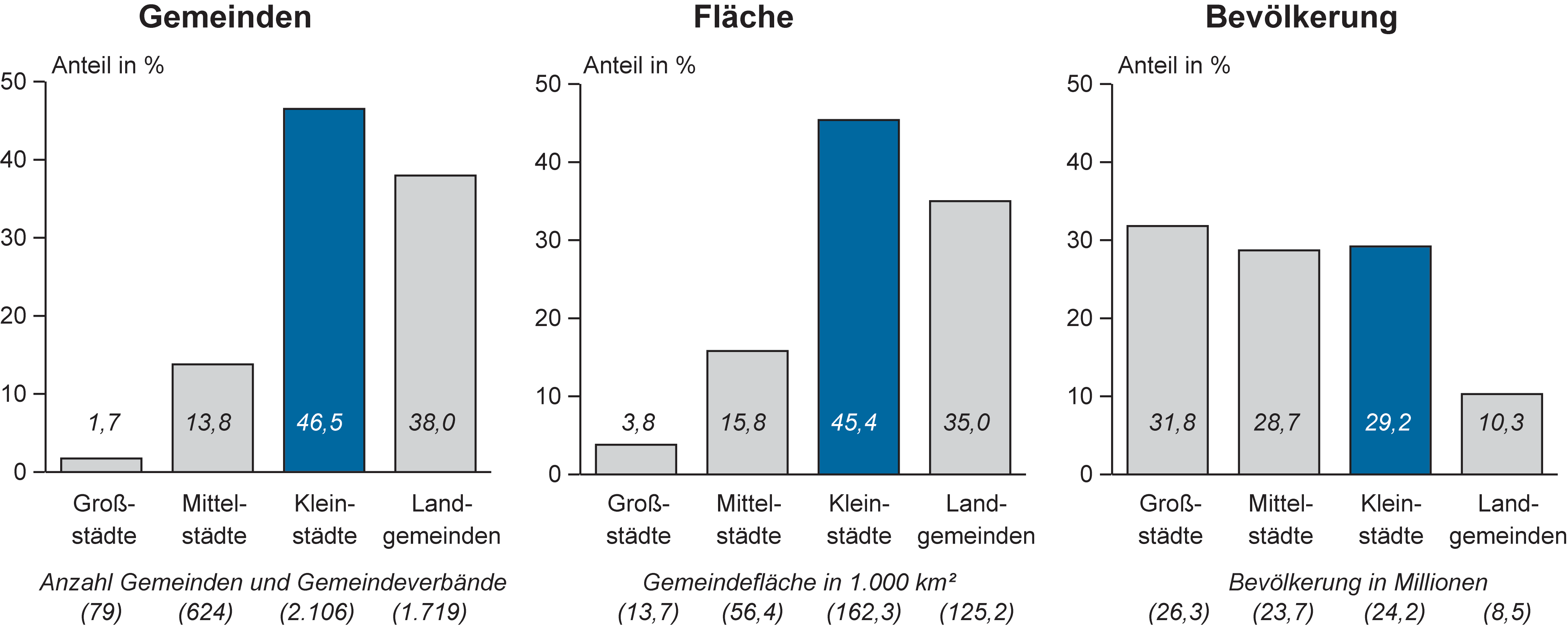 Stadtforschung ist in Deutschland traditionell großstadtorientiert. Auch medial genießen großstädtische Themen und Probleme vorrangige Aufmerksamkeit. Damit stehen die Situation kleinerer Städte und die sie prägenden Strukturen, Verflechtungen und Trends im Schatten des viel diskutierten Großstadtwachstums und der neuen Bedeutung des Städtischen im Zeichen der Reurbanisierung. Zu anderen Stadttypen, insbesondere zu Kleinstädten mit zwischen 5.000 und 20.000 Einwohnerinnen und Einwohnern, wurde bisher empirisch wenig geforscht. Dabei lebt knapp ein Drittel der Bevölkerung in Deutschland in über 2000 Kleinstädten. Keine andere Siedlungskategorie ist so stark vertreten (s. Abb.). Zugleich wird das, was es an Studien zu Kleinstädten gibt, nicht ausreichend wahrgenommen. So halten sich in öffentlichen und teils auch in wissenschaftlichen Diskursen zahlreiche stereotype Vorstellungen und Erzählungen, die Kleinstädte entweder als Orte idyllischen Landlebens oder abwertend als kleinbürgerlichen und rückwärtsgewandten Gegenentwurf zur weltoffenen Großstadt thematisieren. In wissenschaftlichen Arbeiten werden Kleinstädte oft zusammen mit Mittelstädten in einer Mischkategorie als Forschungsgegenstand betrachtet oder als Teilkategorie unter ländlichen Räumen subsumiert, obwohl 56 % der Kleinstädte in räumlich zentralen Lagen zu finden sind. Allein dies deutet darauf hin, dass sich sowohl die Ausgangslagen und Problemstellungen kleiner Städte als auch ihre Chancen je nach Lage im Raum, wirtschaftlichen Gegebenheiten und baulicher Struktur unterscheiden. Kleinstädte sind nach Auffassung des Ad-hoc-Arbeitskreises Kleinstadtforschung der ARL deshalb als ein eigenständiger, vielfältiger Siedlungstyp zu verstehen.