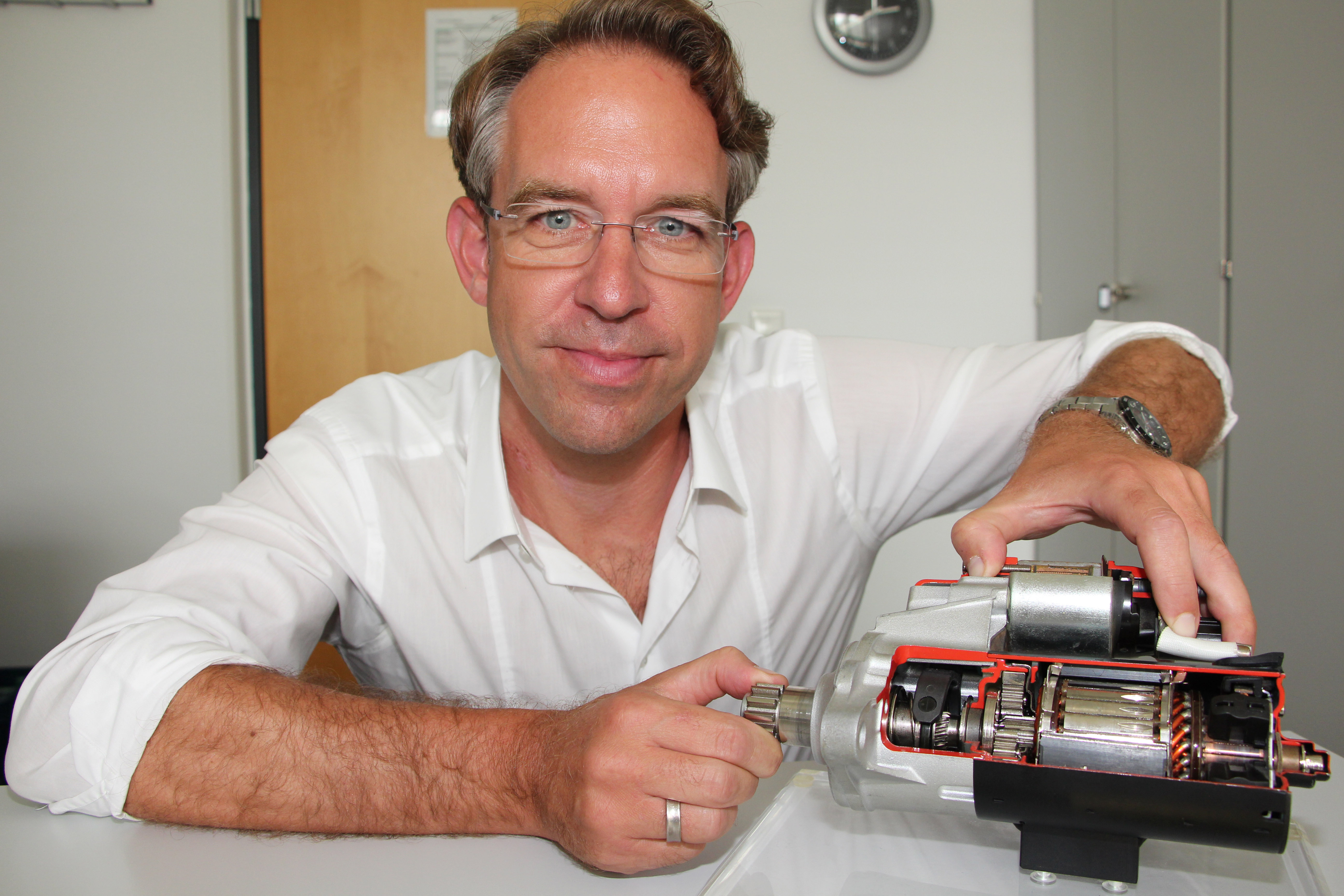 Recklinghausen. Ursprünglich hat Prof. Dr. Sebastian Schlösser-Kranzusch in Göttingen Physik studiert und sich bei seiner Doktorarbeit damit beschäftigt, wie man mit laserinduzierten, extrem kurzwelligen Strahlen die immer kleiner werdenden Computerchips belichten kann. Sein Erfolgserlebnis dabei war, dass es nicht nur wissenschaftlich interessant und wissenserweiternd war, sondern so erfolgreich, dass die optische Industrie seine neu dafür entwickelte Kamera direkt in die Produktion übernahm. Möglicherweise hat Schlösser-Kranzusch an dieser Stelle zum ersten Mal den süßen Nektar der Industrietauglichkeit von Forschung geleckt, egal, sie sollte ihn nie wieder verlassen. 15 Jahre lang arbeitete er, nachdem er zunächst noch industrienahe Forschungsvorhaben an der Universität geleitet hatte, bei Volkswagen und arbeitete sich vom technischen Entwickler über verschiedene Karrierestufen bis zum Assistenten eines Bereichsleiters und schließlich zum Leiter der Entwicklungsabteilung für elektrische Komponenten empor: „Für mich war das ein Traumjob, da er Technik, Wirtschaftlichkeit, Führung und Verwaltung kombinierte.“ Aber er versuchte sich an der „AutoUni“ in Wolfsburg auch in der Lehre. Damit war die Weiche gestellt, sich als Professor an die Hochschulabteilung Recklinghausen der Westfälischen Hochschule berufen zu lassen. Sein Lehrgebiet: Mechatronik. Das ist die Kombination aus Mechanik und Elektronik sowie Informatik. „Und das“, so Professor Dr. Sebastian Schlösser-Kranzusch, „fordert von den Studierenden, immer einen Schritt weiter zu denken, denn diese Sachgebiete wollen vernetzt zusammengedacht und in sinnvolle Algorithmen gebracht werden, damit das elektronische Bauteil in der Industriepraxis mechanisch funktioniert und elektronisch gesteuert werden kann.“