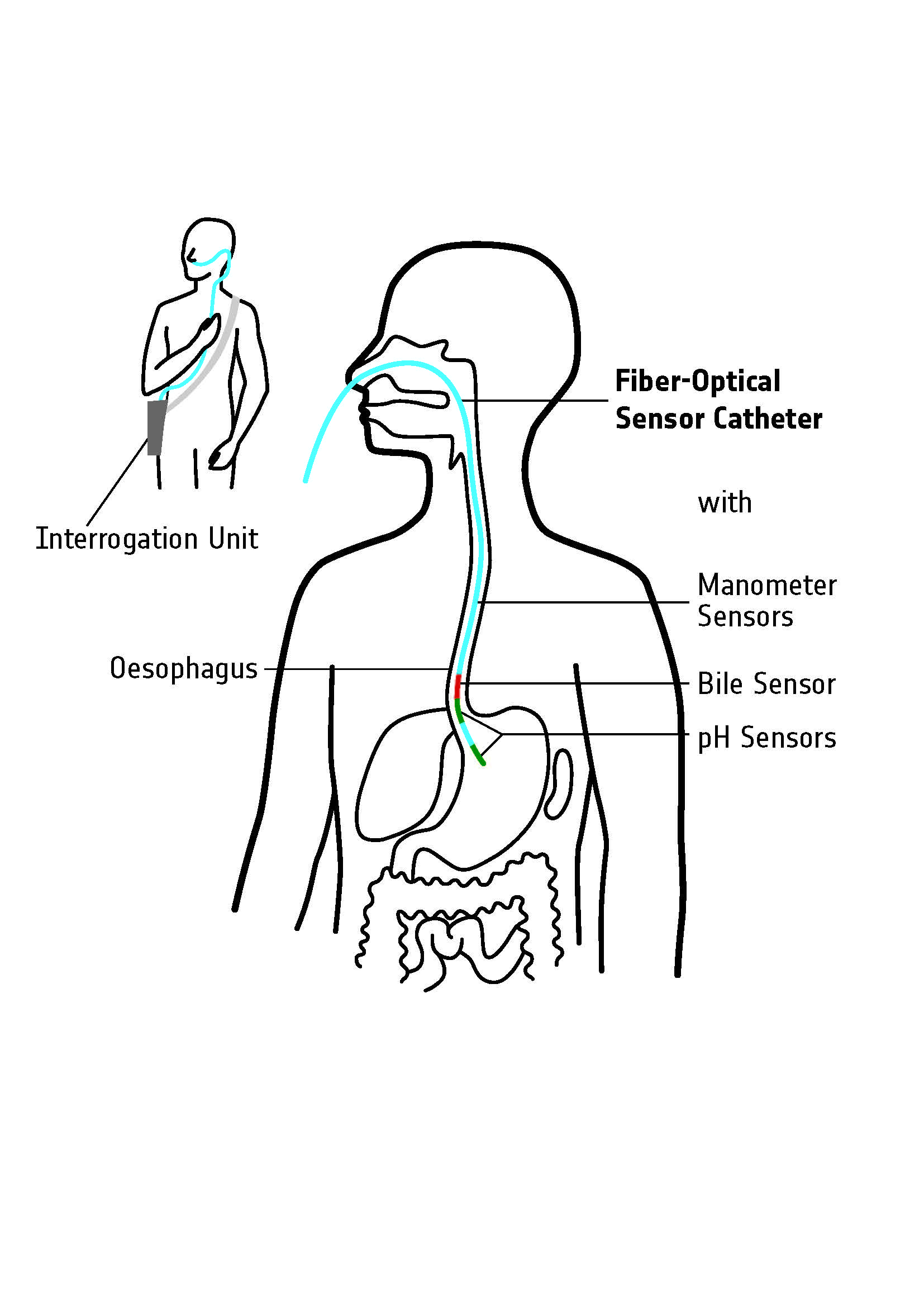 Um an vielen verschiedenen Stellen der Speiseröhre gleichzeitig den Druck zu messen und so die Peristaltikbewegungen nachvollziehen zu können, ordnen die Forscher zehn bis fünfzehn faseroptische „Dehnungsmessstreifen“ — sogenannte Faser-Bragg-Gitter-Sensoren — in einer optischen Faser an. An welchen Stellen die Messungen jeweils durchgeführt werden, können sie anhand unterschiedlicher Wellenlängen der einzelnen Sensoren bestimmen. Dank weiterer faseroptischer Sensoren im Bereich des Magens und darüber, lassen sich mit dem Katheter gleichzeitig mit den Druck- auch pH- und Gallenwerte ermitteln und miteinander verknüpfen. Das ermöglicht es Medizinern, neue Erkenntnisse über die Ursachen von Erkrankungen zu gewinnen.