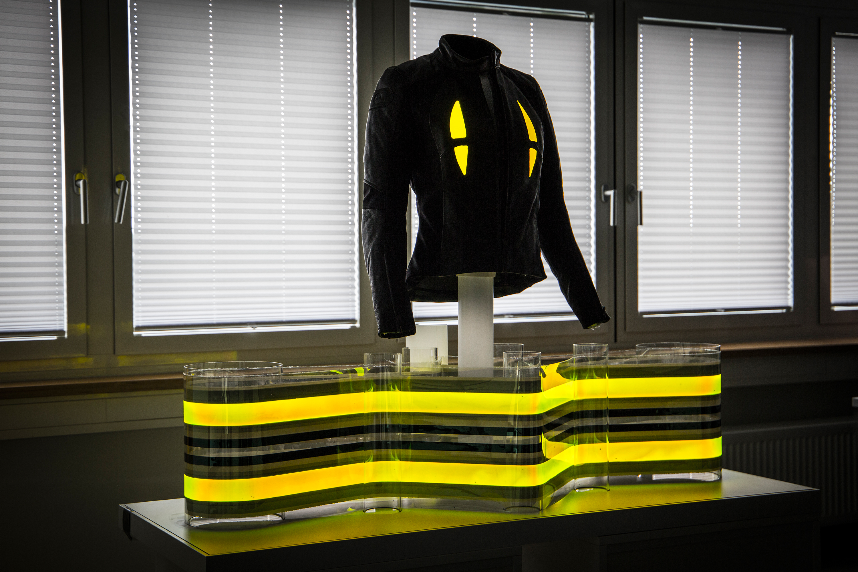 Frei formbar, ultradünn, farbvariabel, transparent und biegsam – diese Attribute zeichnet die innovative OLED-Technologie aus. Innerhalb des PI-SCALE Projektes und durch Etablierung des OLED-Pilotlinienservices LYTEUS entstand der weltweit längste OLED-Streifen im Rolle-zu-Rolle-Verfahren. Insgesamt konnten mehr als zehn verschiedenartige Demonstratoren in Zusammenarbeit mit den Partnern des Konsortiums gebaut werden. Neben dem weltweit längsten OLED-Streifen auch der weltweit größte OLED-Demonstrator, mit den Maßen 30 cm × 180 cm. Als Flächenlichtquelle sind die Anwendungsbereiche für OLED schier unerschöpflich. Ob Automotive, Sicherheitswesen, Beleuchtung im Allgemeinen, Light-Design-Engineering, Inneneinrichtung, Möbel, Luftfahrt oder Architektur: durch dimmbare farbveränderliche OLED ist der gestalterischen Freiheit fast keine Grenze zu setzen (vgl. Bild 1). Zusammen mit der EMDE development of light GmbH entstand beispielsweise die erste, in eine Motorradjacke integrierte flexible OLED (siehe Bild 2). Durch diesen Einsatz in Kleidungsstücken können völlig neue Impulse im Bereich Ästhetik und Design gesetzt werden. Außerdem verbessern Lichtelemente in Motorradkleidung die Sichtbarkeit ihrer Träger und erhöhen dadurch die Sicherheit im Straßenverkehr.