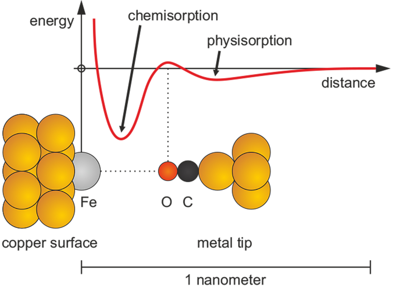 However, the nature of the interaction of atoms and molecules with surfaces is even more complex as was already found by the physicist Lenard-Jones back in 1932. In some cases, two modes of bonding can occur: a weak bonding, called physisorption and a strong bonding, called chemisorption. Physisorption makes dust stick to surfaces or allows geckos to walk on walls and ceilings without falling off. Chemisorption is ten to one hundred times stronger than physisorption. The interplay between physisorption and chemisorption is crucial for the cleaning of exhaust gas in catalytic converters of cars and in industrial reactors that build basic chemicals by catalytic reactions. The two modes of adsorption are expressed by an energy curve that shows two minima. Those energy curves have been displayed in textbooks of physical chemistry and surface science for decades, although experimental access had been limited to the equilibrium points where physisorption and chemisorption occur. A group of experimental physicists from the University of Regensburg (Ferdinand Huber, Julian Berwanger, Franz J. Giessibl) have been able to experimentally record the genesis of the energy curve that is involved in the transition from physisorption to chemisorption. They achieved this by attaching a CO molecule to the tip of an atomic force microscope and moving it towards a single iron atom that sits on a copper surface while recording the force that acted in the process. The team included quantum chemists (Svitlana Polyesa, Sergiy Mankovsky, Hubert Ebert) from the Ludwig-Maximilians-Universitity Munich, who worked out the theoretical explanation. Overcoming the energetic barrier between physisorption and chemisorption requires a rearrangement of the electrons (hybridization) that make up the bonds as has been confirmed in the quantum chemical calculations.