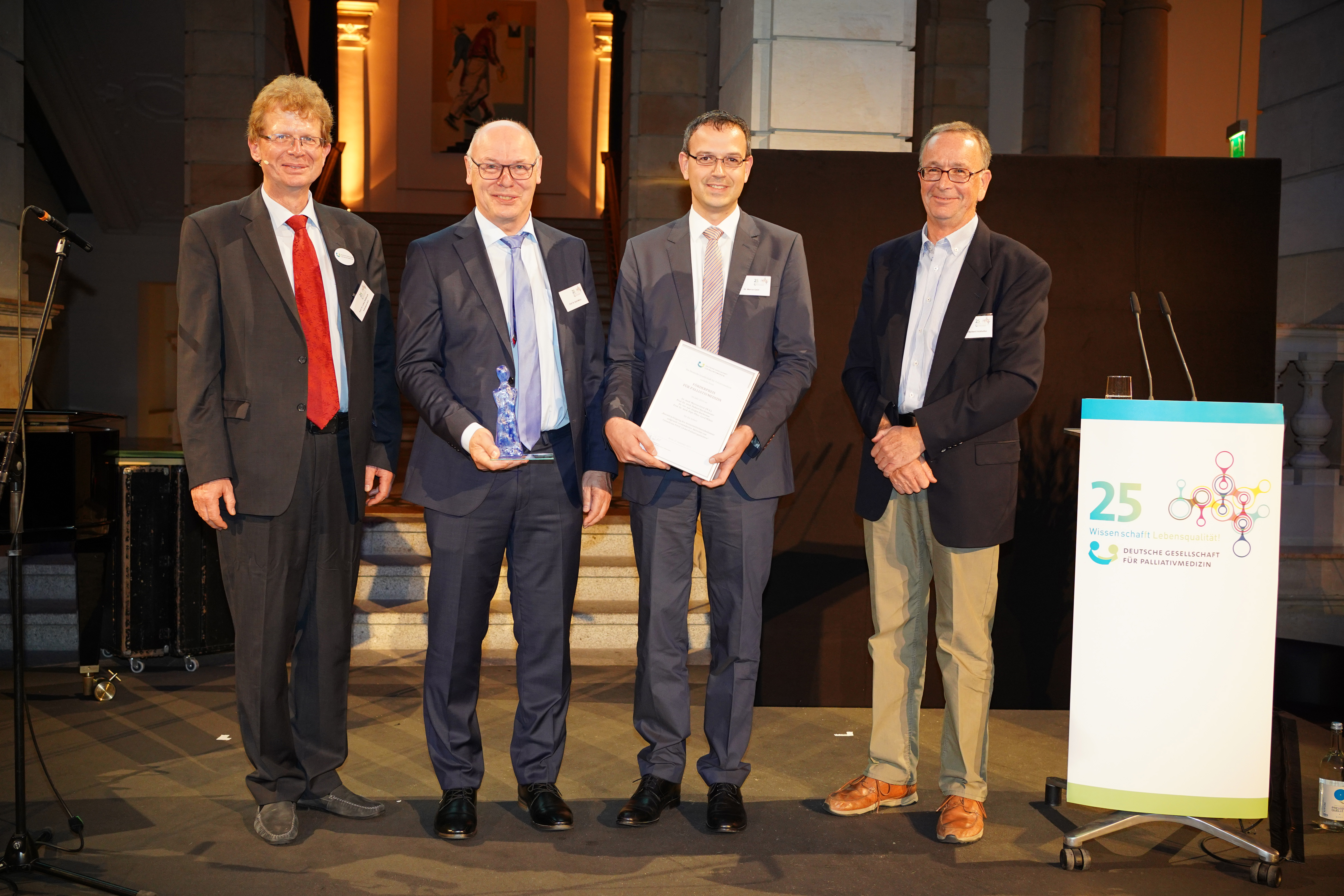 Im Rahmen des Festaktes zum 25-jährigen Jubiläum der Deutschen Gesellschaft für Palliativmedizin hat DGP-Präsident Prof. Dr. med. Lukas Radbruch den diesjährigen Förderpreis für Palliativmedizin an die Autoren einer Studie am Universitätsklinikum Heidelberg verliehen. Die multidisziplinäre Jury unter Leitung von Prof. Dr. med. Norbert Frickhofen entschied sich entlang inhaltlicher, wissenschaftlicher und formaler Bewertungskriterien für die Vergabe des Preises an folgende Arbeit: "Beeinträchtigung des Arzneimittelmetabolismus aufgrund verminderter Aktivität von Cytochrom P450 3A bei Palliativpatienten". Preisträger sind: Dr. med. Marcus Geist (M.A.), Prof. Dr. med. Hubert Bardenheuer, Dr. rer. nat Jürgen Burhenne, Prof. Dr. med. Dipl.-Phys. Gerd Mikus, Universitätsklinikum Heidelberg.