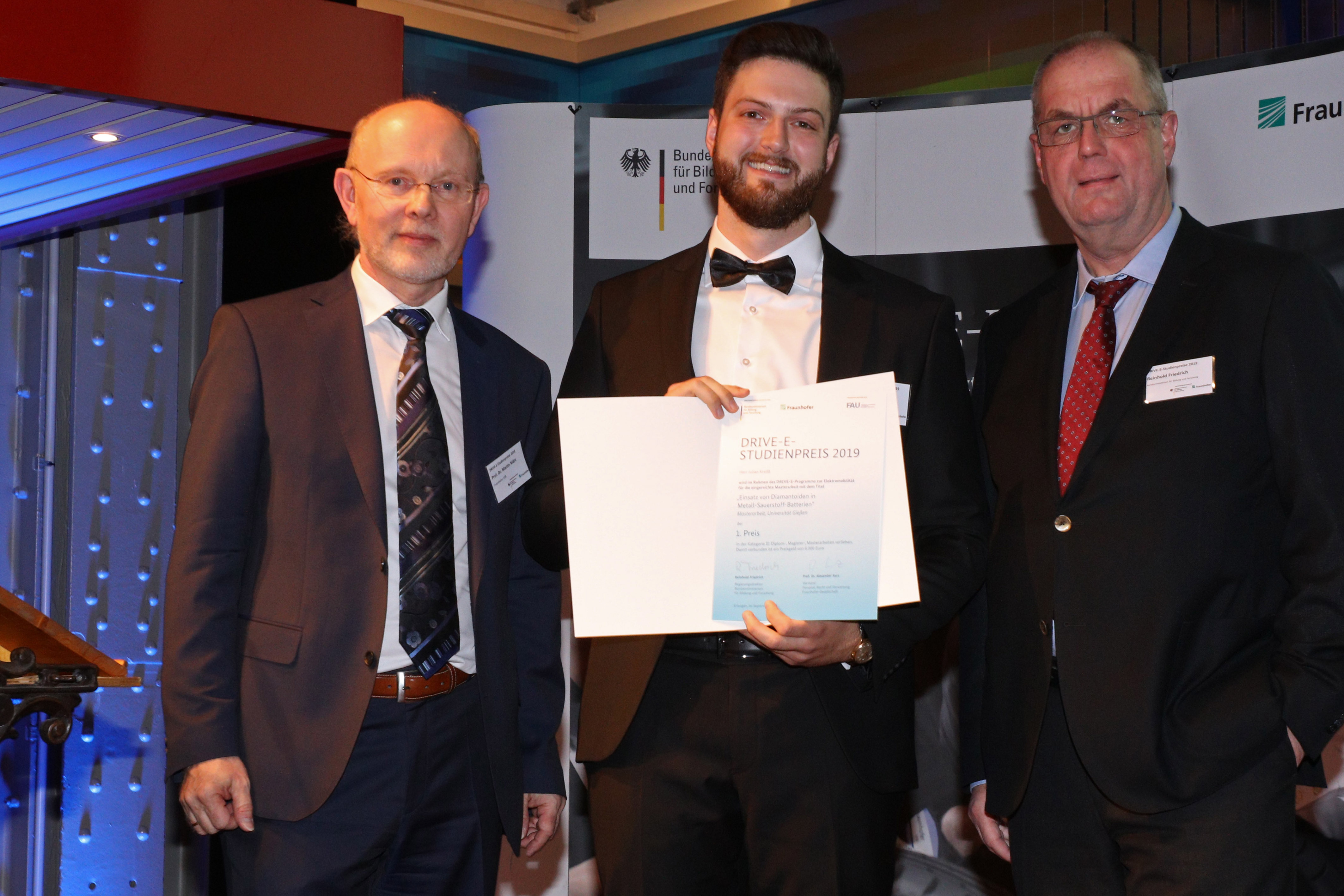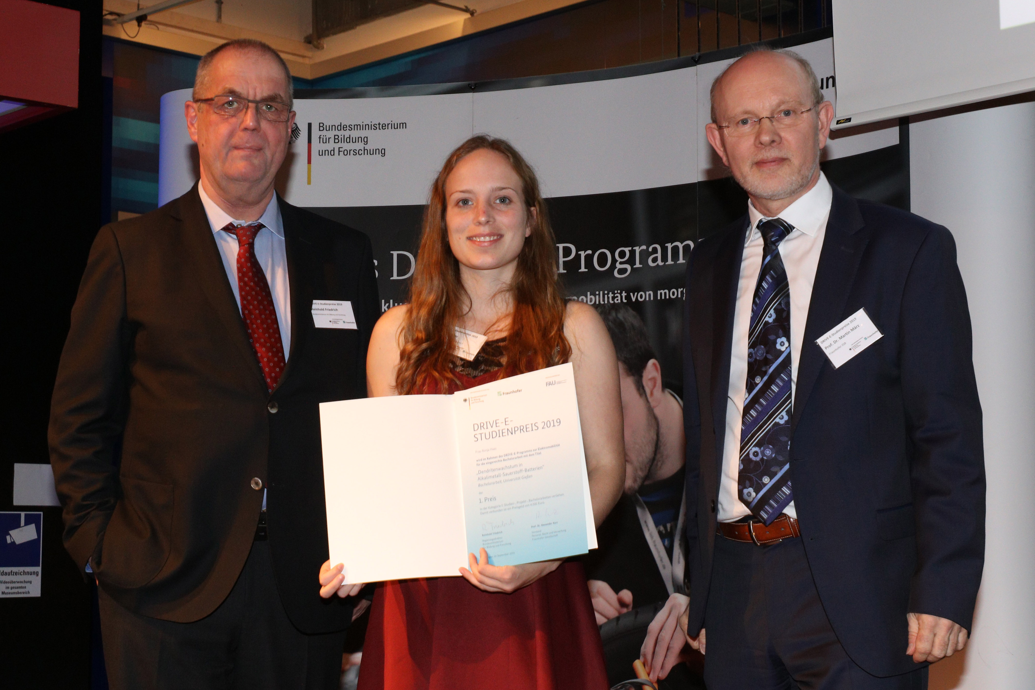 Im Rahmen des studentischen Nachwuchsprogramms für Elektromobilität des Bundesministeriums für Bildung und Forschung (BMBF) und der Fraunhofer‐Gesellschaft, DRIVE-E, werden jährlich hervorragende und innovative Projekt-, Studien- und Abschlussarbeiten aus dem Bereich Elektromobilität mit dem DRIVE-E-Studienpreis ausgezeichnet. In diesem Jahr waren Studierende aus der Nachwuchsgruppe von Dr.-Ing. Daniel Schröder und der Arbeitsgruppe von Prof. Dr. Jürgen Janek (Physikalisch-Chemisches Institut und Zentrum für Materialforschung der Justus-Liebig-Universität Gießen (JLU)) gleich doppelt erfolgreich: Anlässlich der diese Woche in Nürnberg stattfindenden DRIVE-E-Akademie erhielt Ronja Haas den ersten Preis für Ihre Bachelorarbeit, zudem wurde Julian Kreißl in der Kategorie „Beste Masterarbeit“ mit dem ersten Preis ausgezeichnet.