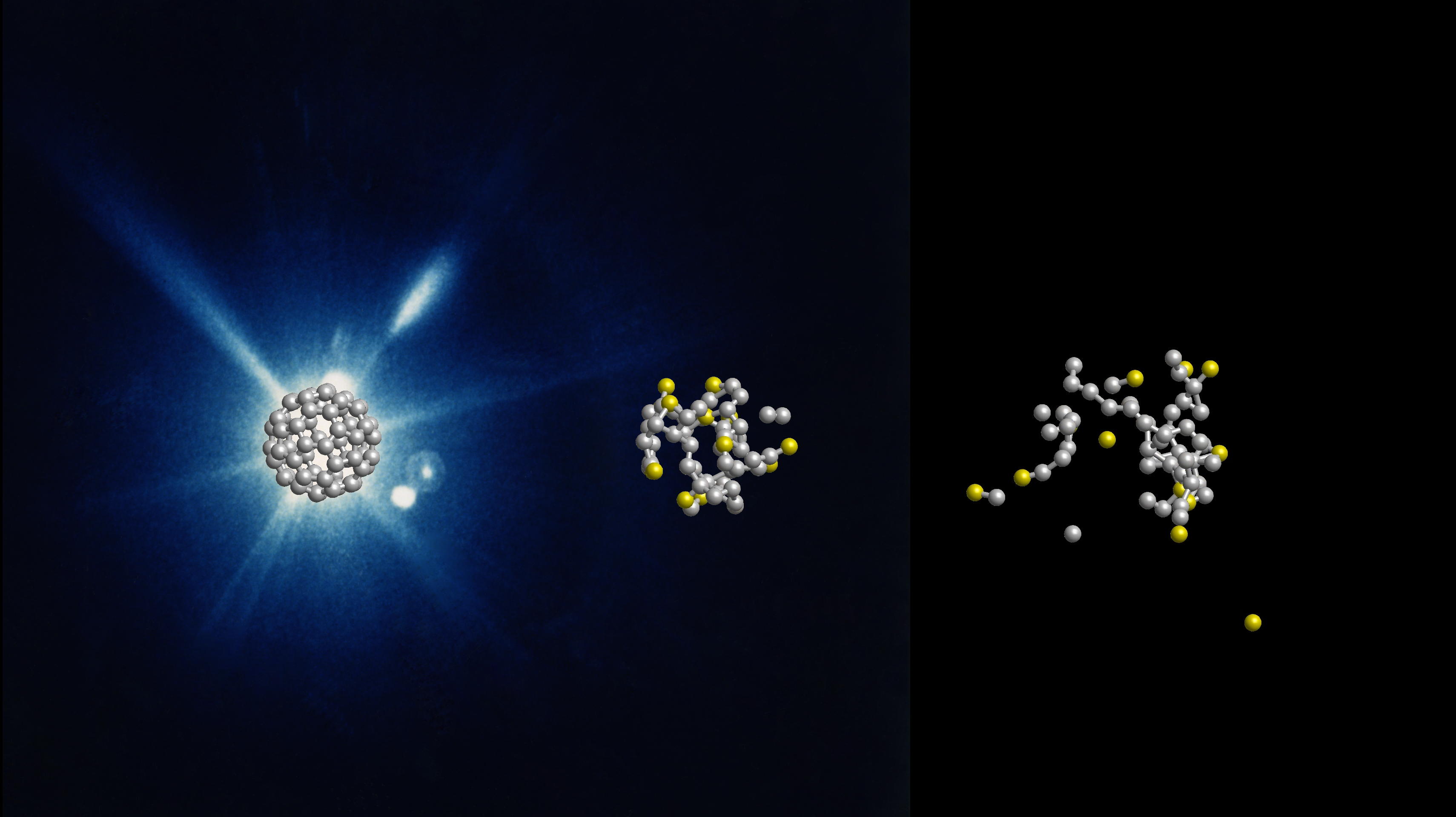 „Typischerweise fliegen etwa 25 neutrale und nur 15 elektrisch geladene Kohlenstoffatome aus dem Molekül“, erläutert Santra. „Der Rest bildet Fragmente aus mehreren Atomen.“ Der ganze Prozess dauert rund 600 Femtosekunden. Das ist nach menschlichen Maßstäben immer noch unvorstellbar kurz, für die Strukturanalyse mit Röntgenlasern jedoch extrem lang. „In den typischerweise 20 Femtosekunden eines Röntgenlaserblitzes bewegen sich die Atome maximal 0,1 Nanometer – das ist im Bereich einzelner Atomdurchmesser und kleiner als die Messgenauigkeit der Strukturanalyse.“ Ein Nanometer ist ein millionstel Millimeter.