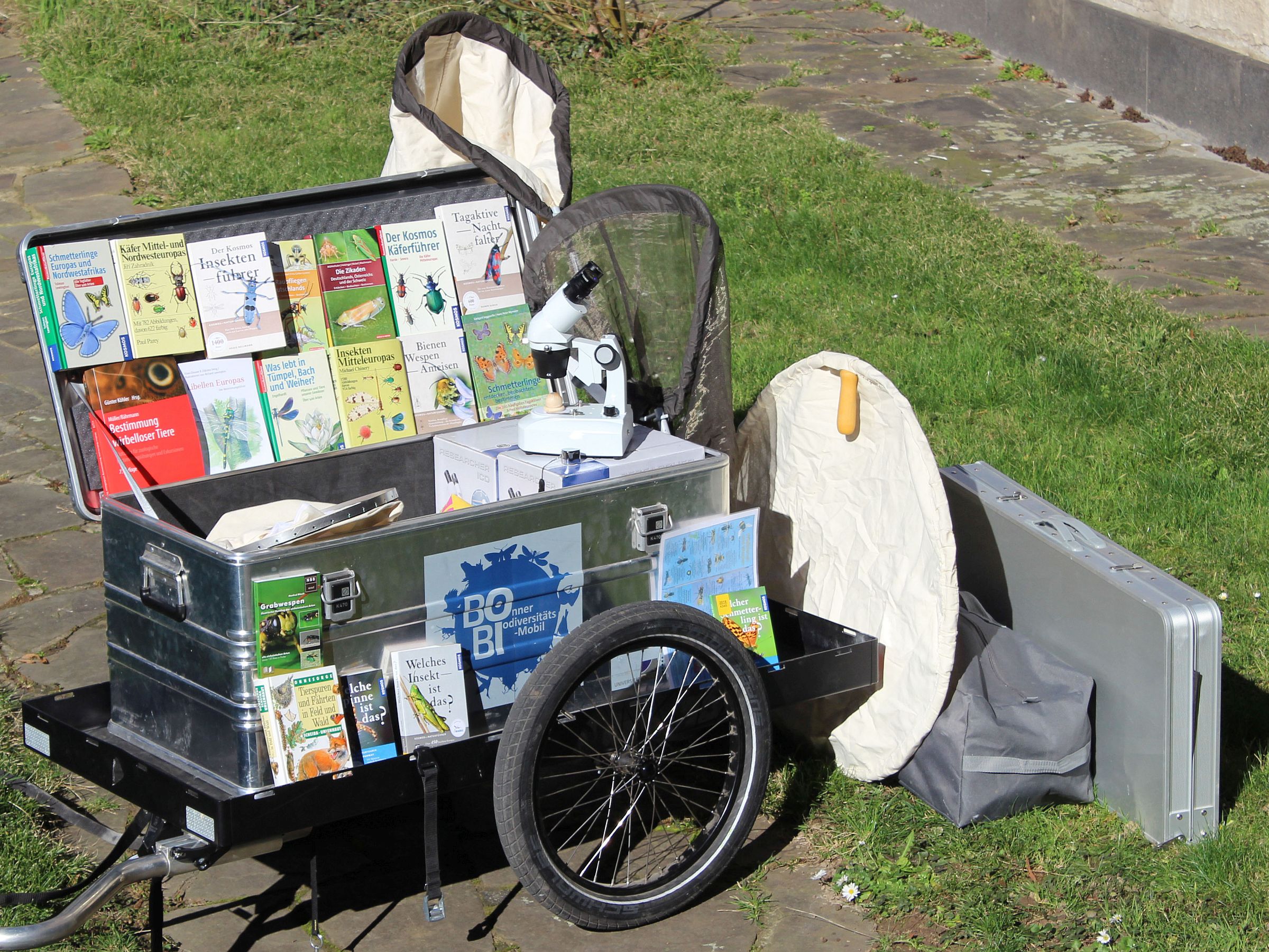 Der Verlust von Arten- und Lebensraumvielfalt betrifft uns alle. Die Fachdidaktik Biologie an der Universität Bonn hat sich zum Ziel gesetzt, Menschen für Biodiversität zu begeistern. Das Bonner Biodiversitäts-Mobil „BoBi“ ist ein Lehr- und Forschungsprojekt, das Biodiversität „erfahrbar“ macht: Die mobile Forschungsstation kann auf einem Fahrradanhänger transportiert werden und gelangt so überall hin, auch abseits von Wegen oder Straßen. Ausgerüstet ist sie mit Instrumenten, mit denen unterschiedliche Lebensräume entdeckt und erforscht werden können. Das wissenschaftliche Interesse des Projekts gilt der Frage, wie das Interesse Jugendlicher an heimischen Insekten gefördert werden kann. Darüber hinaus wird es auch in der universitären Lehre für Exkursionen mit Studierenden eingesetzt.