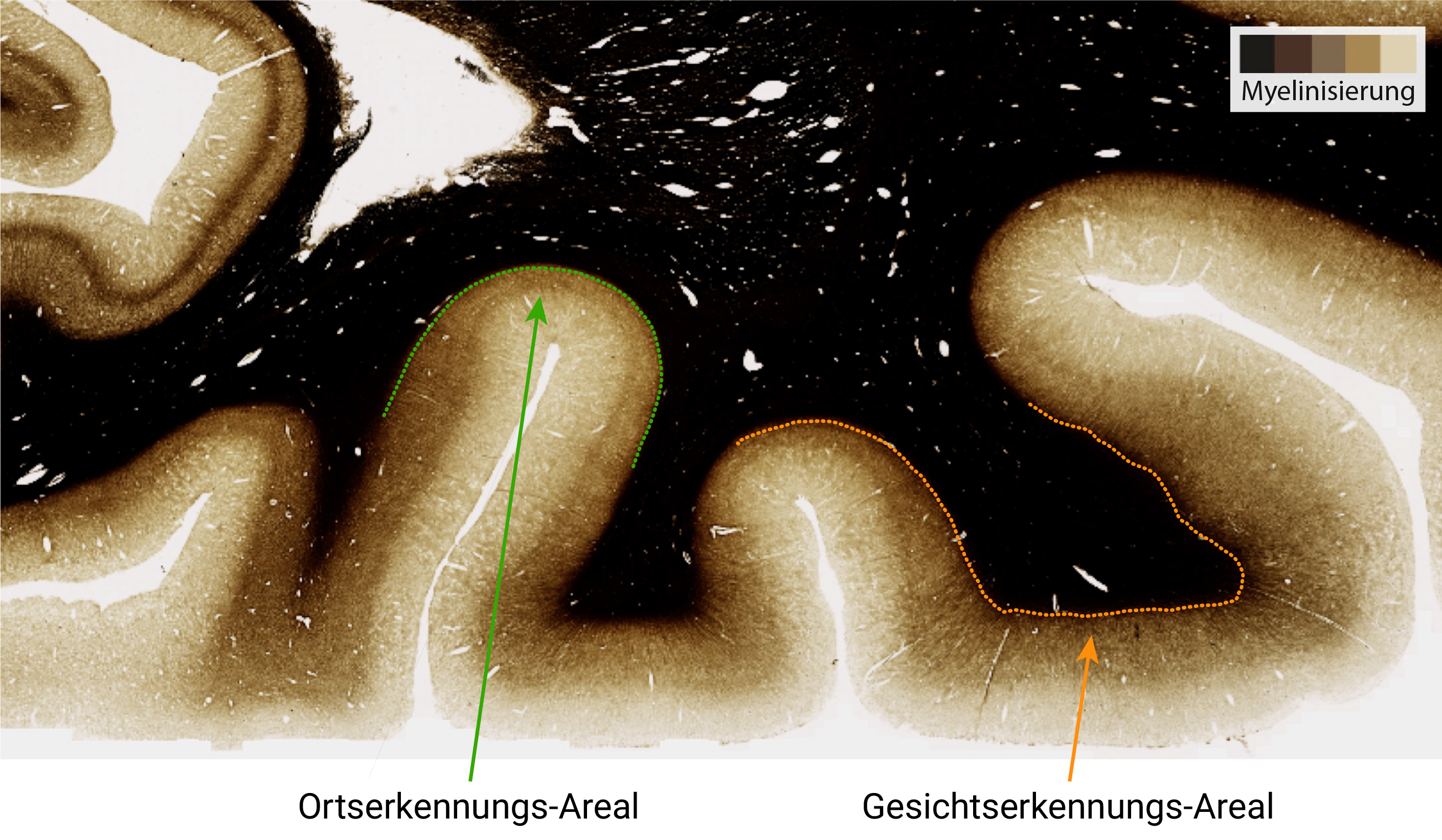 Das Team untersuchte drei spezialisierte Teile des Gehirns im höheren visuellen Kortex. Trotz ihrer unmittelbaren räumlichen Nähe zeigten alle ein einzigartiges Entwicklungsmuster, was die Notwendigkeit einer vorsichtigen Interpretation unterstreicht. In den Gehirnteilen, die für die Gesichts- und visuelle Worterkennung verantwortlich sind, zeigte sich der oben beschriebene Myelinisierungseffekt. Wiederum zeigte der Teil, welcher die Ortserkennung zur Aufgabe hat, keinen Hinweis auf eine Myelinisierung. Stattdessen schien er sich mit der Zeit morphologisch zu verändern und über die Zeit zu dehnen. Um den wichtigen Zusammenhang zwischen Struktur und Funktion hervorzuheben, wurden die Unterschiede in der Myelinisierung dieser funktionell spezialisierten Regionen bei Hirnen verstorbener Erwachsener bestätigt, wobei sowohl die Ultrahochfeld-MRT als auch die Histologie zum Einsatz kamen.
