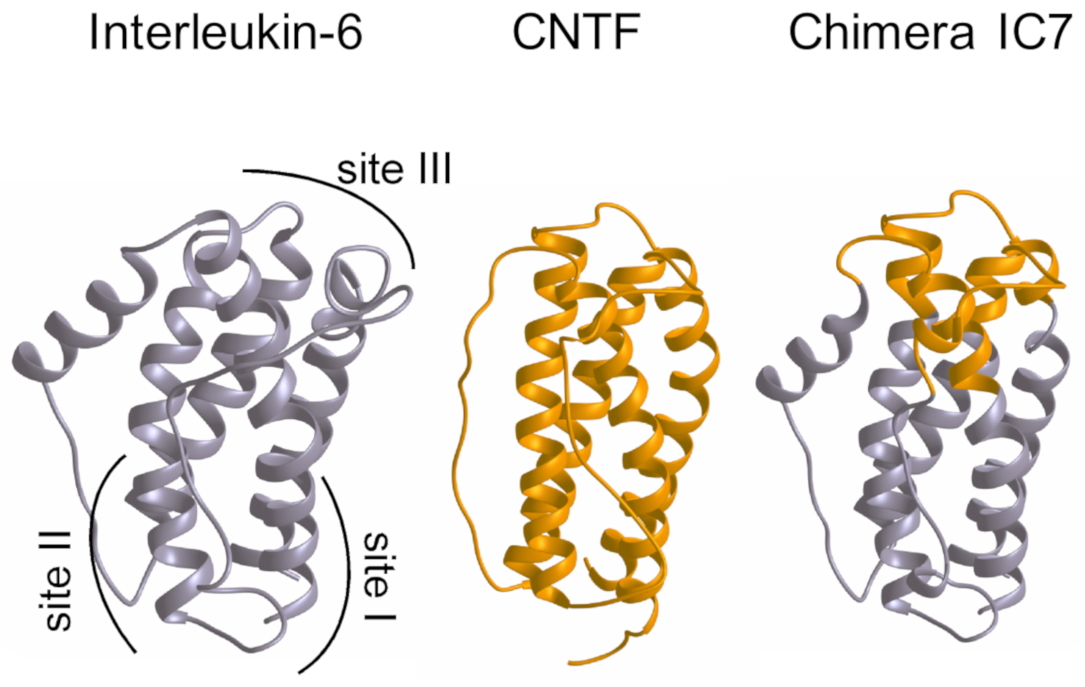 The artificial molecule IC7 (and also the ensuing molecule IC7Fc) largely consists of blocks of Interleukin-6 (IL-6, gray) and a section from a block of CNTF (gold).