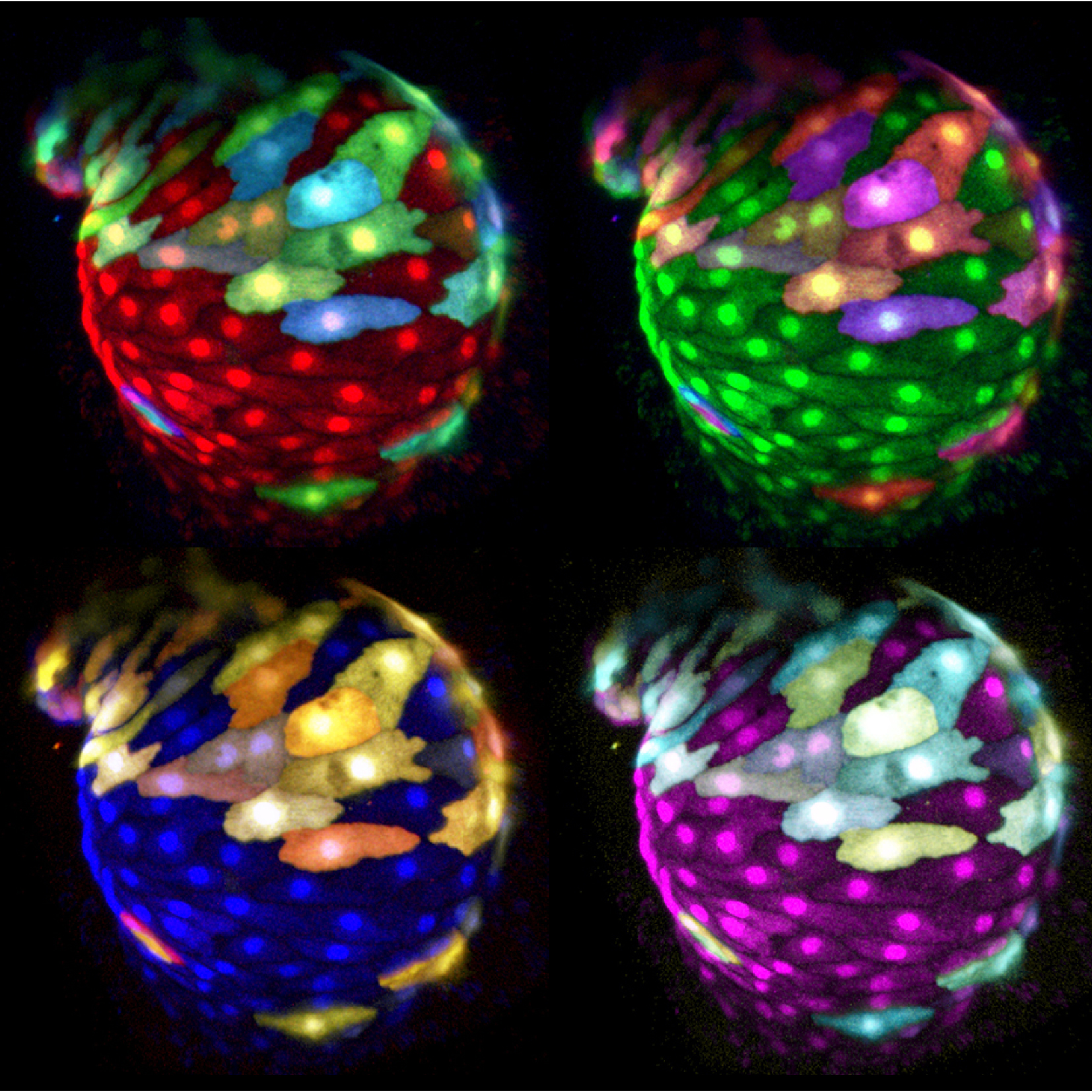 Ein Foto ist angefügt. Das Bild zeigt ein Zebrafischherz in vier Farbvariationen in einer der getesteten genetischen Varianten, die zu einem massiven Wachstum des Vorhofes führen. Durch eine Mehrfarben-Mosaik-Markierung des Herzmuskelgewebes in Kombination mit einer hochauflösenden 4D-Konfokalmikroskopie können die genauen dreidimensionalen Änderungen der Zellgrößen bestimmt werden.