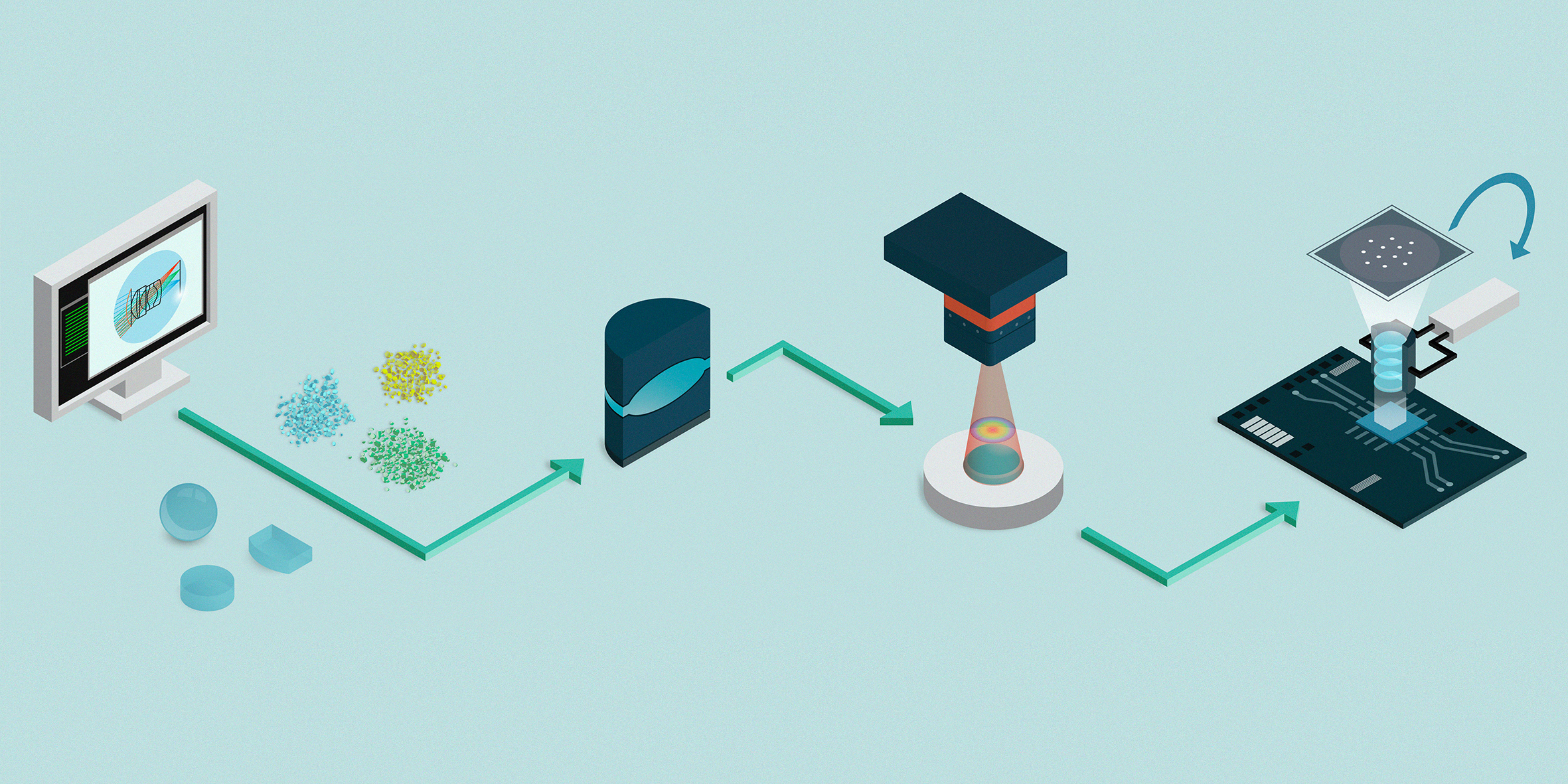 Ein vorrangiges Ziel des ACOP ist es, die Digitalisierung und Vernetzung von Prozessen zur Fertigung hochpräziser optischer Komponenten zu fördern. Dabei nehmen die Aachener Forscherinnen und Forscher sowohl die Herstellungsprozesse von Bauteilen aus Glas und Kunststoff als auch die eingesetzten Technologien genau unter die Lupe. Indem sie die einzelnen Schritte der Prozesskette – von der Simulation über die Replikation und Montage der Optiken bis zur Qualitätsprüfung durch hochpräzise Messtechnik – digital miteinander verknüpfen, können sie Rückschlüsse auf Verbesserungen ziehen. Auf diese Weise kann die Fertigung schneller und kostengünstiger gestaltet werden.