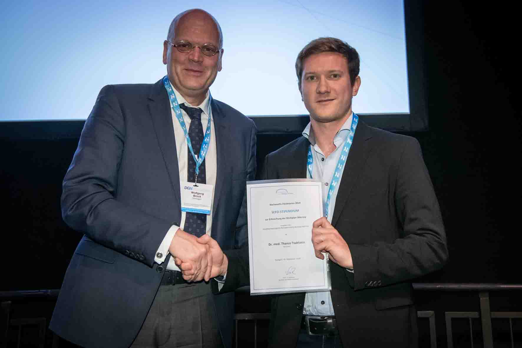Dr. med. Thanos Tsaktanis (Klinikum rechts der Isar der TU München) ist der diesjährige Stipendiat des SEED-Programms des Kompetenznetzes Multiple Sklerose (KKNMS). Er wurde im Rahmen des KKNMS-Symposiums beim DGN-Kongress in Stuttgart am 26. September ausgezeichnet. Zur Durchführung seines Forschungsprojekts erhält der Preisträger 32.000 Euro und wird für sechs Monate von seinem Arbeitgeber freigestellt.