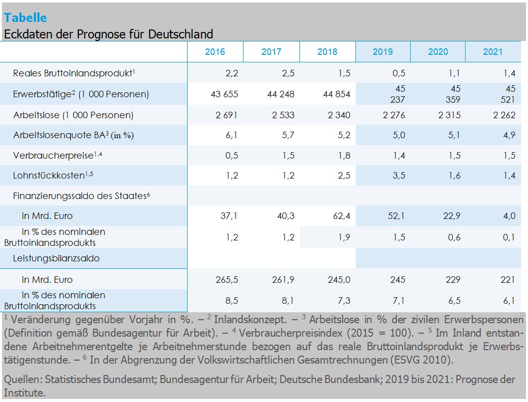 Der Beschäftigungsaufbau verliert als Folge der konjunkturellen Abkühlung an Fahrt; die Industrie hat jüngst sogar Stellen abgebaut. Hingegen stellen Dienstleister und die Bauwirtschaft weiter ein. In diesem Jahr rechnen die Institute daher mit einem Beschäftigungsaufbau von 380.000 Stellen. In den kommenden beiden Jahren werden voraussichtlich nur noch 120.000 beziehungsweise 160.000 neue reguläre Arbeitsverhältnisse geschaffen. Die Arbeitslosenquote steigt im Jahr 2020 auf 5,1% von 5,0% im Jahr 2019 und dürfte dann im Jahr 2021 wieder auf 4,9% sinken. Die Verbraucherpreise werden weiterhin nur moderat um 1,4% im Jahr 2019, 1,5% im Jahr 2020 und 1,6% im Jahr 2021 zulegen. Die Überschüsse des Staats sind in diesem Jahr mit voraussichtlich rund 50 Mrd. Euro noch beträchtlich. Allerdings schmelzen sie bis zum Jahr 2021 auf rund 4 Mrd. Euro.
