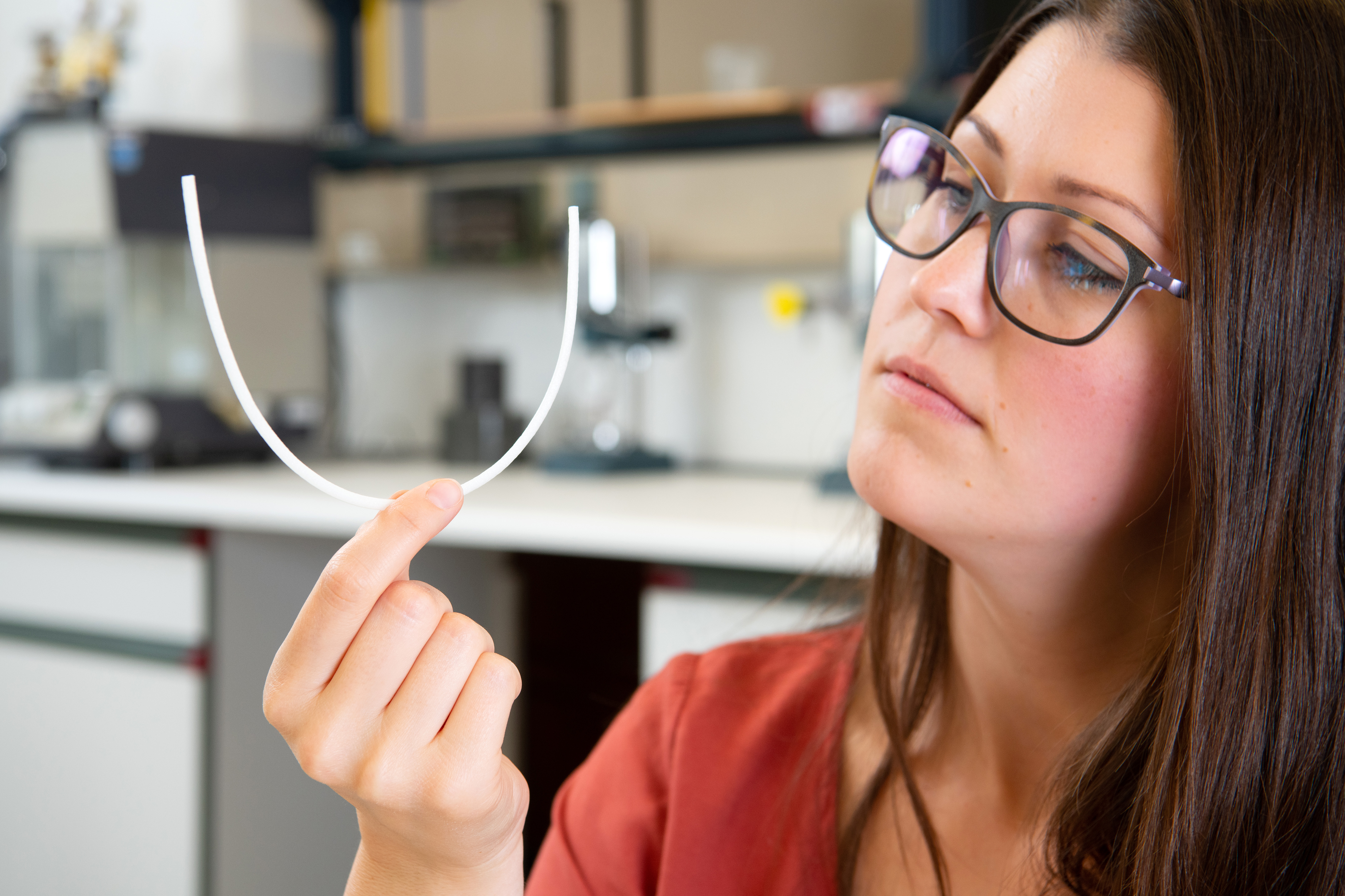 Bei der Überprüfung der Zugfestigkeit wird der Bügel unterschiedlich stark gedehnt und gestaucht, was den Druck der Brust simuliert und zeigt, wie belastbar das Material ist. In beiden Tests überzeugte der faserverstärkte Kunststoffbügel im Vergleich zum nicht verstärkten Kunststoffbügel, den die Forscherinnen und Forscher parallel eben-falls testeten.