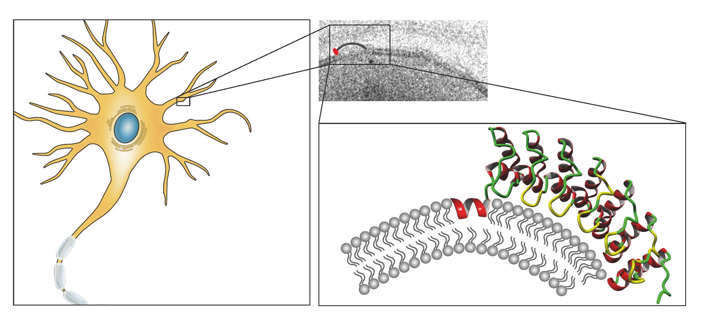 Dazu testeten die Wissenschaftler und Wissenschaftlerinnen Ankycorbin auf drei wesentliche Eigenschaften: Zunächst wiesen sie mit verschiedenen Methoden nach, dass das Protein überhaupt an Membranen binden kann. Dann müssen Membrankrümmungsproteine über eine ausgedehnte gekrümmte Bindungsfläche verfügen – mit den leicht gebogenen Ankyrin repeats ist Ankycorbin dafür bestens ausgestattet und bevorzugte in der Tat gekrümmte Membranen. Mittels hochauflösender, elektronenmikroskopischer Analysen von sich entwickelnden Neuronen konnten die Wissenschaftler schließlich auch zeigen, dass das Protein an Nervenzellmembranen größere Überstrukturen bildet. Biochemisch konnte nachgewiesen werden, dass sich mehrere Moleküle Ankycorbin zusammenlagern können. Dadurch kann eine Krümmung der Membran über einen größeren Bereich fortgesetzt werden. Interessanterweise traten solche Ankycorbin-Cluster vorwiegend an eng umgrenzten, auswärts gekrümmten Membranarealen auf.