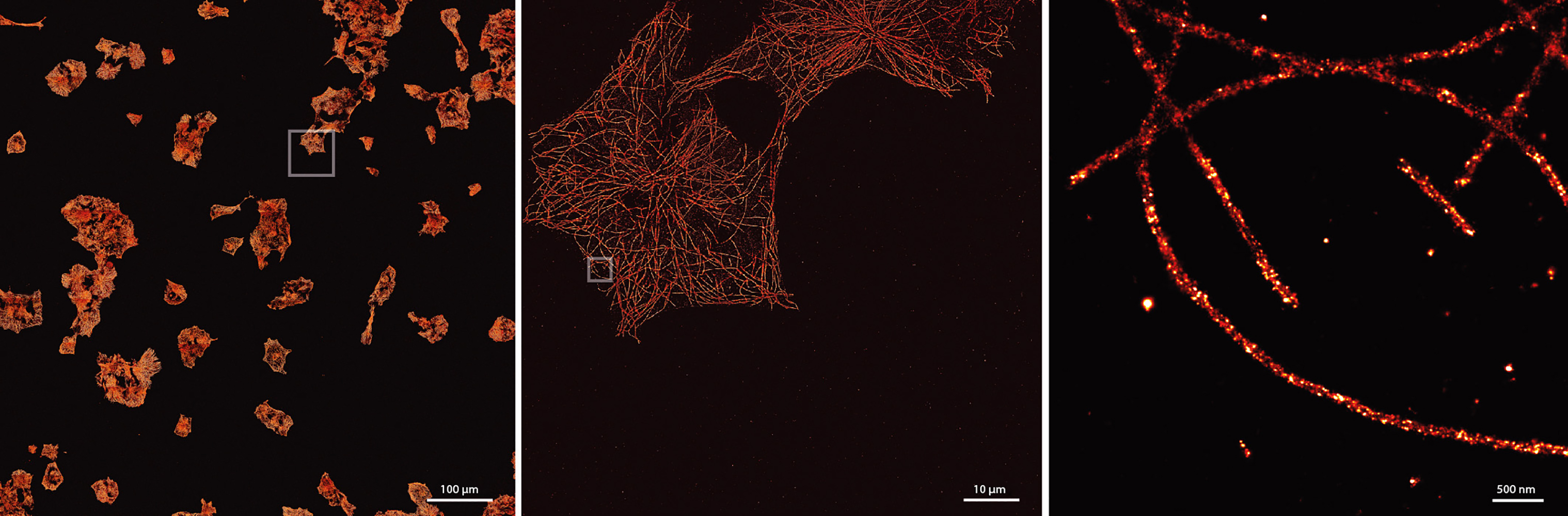 Um die Verbesserungen der DNA-PAINT-Technik zu testen, kombinierten die Forscher diese mit DNA-Origami-Strukturen. Hierbei handelt es sich um selbstassemblierende DNA-Objekte in Nanometergröße, die sich autonom zu einer Art „Steckplatte“ falten. Auf dieser befinden sich die Gegenstränge, die als definierte Punkte im Abstand von ungefähr 5 nm aufgetragen sind. Unter dem Mikroskop untersuchten die Forscher so die verbesserte Messgeschwindigkeit unter definierten Bedingungen. Im nächsten Schritt konnte die verbesserte Aufnahmegeschwindigkeit auch in zellulärer Umgebung gezeigt werden. Hierzu wurden in einer Zellprobe die Mikrotubli, ein Teil des Zytoskelettes, mit 10-fach höherer Geschwindigkeit sichtbar gemacht. „Wir konnten so ein quadratmillimetergroßes Areal in 8 Stunden bei einer Auflösung von 20 nm aufnehmen. Das hätte vorher fast vier Tage gedauert!“, erklärt Florian Schüder.
