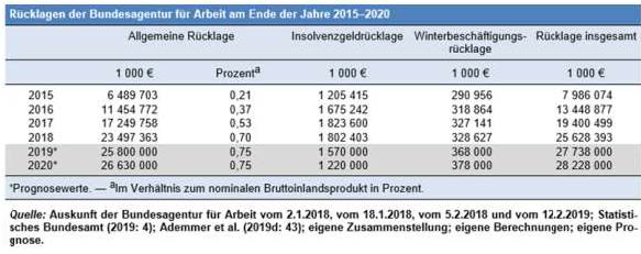 Trotz des Konjunkturabschwungs, des gesunkenen Beitragssatzes und den deutlichen Leistungsausweitungen bleibt der Einnahmensaldo aber positiv, und die BA dürfte im Jahr 2019 Überschüsse von 2,1 Mrd. Euro, im Jahr 2020 Überschüsse von 0,5 Mrd. Euro erzielen. Ihre ohnehin schon sehr hohen Rücklagen steigen damit weiter von 23,5 Mrd. Euro Ende 2018 auf 25,8 Mrd. Euro in diesem und 26,6 Mrd. Euro im nächsten Jahr, dies entspricht dann jeweils 0,75 Prozent des Bruttoinlandsproduktes (BIP). Die Insolvenzgeldrücklage und die Wintergeldrücklage der BA sind hierbei noch nicht berücksichtigt, mit ihnen betragen die gesamten Rücklagen 28,2 Mrd. Euro.