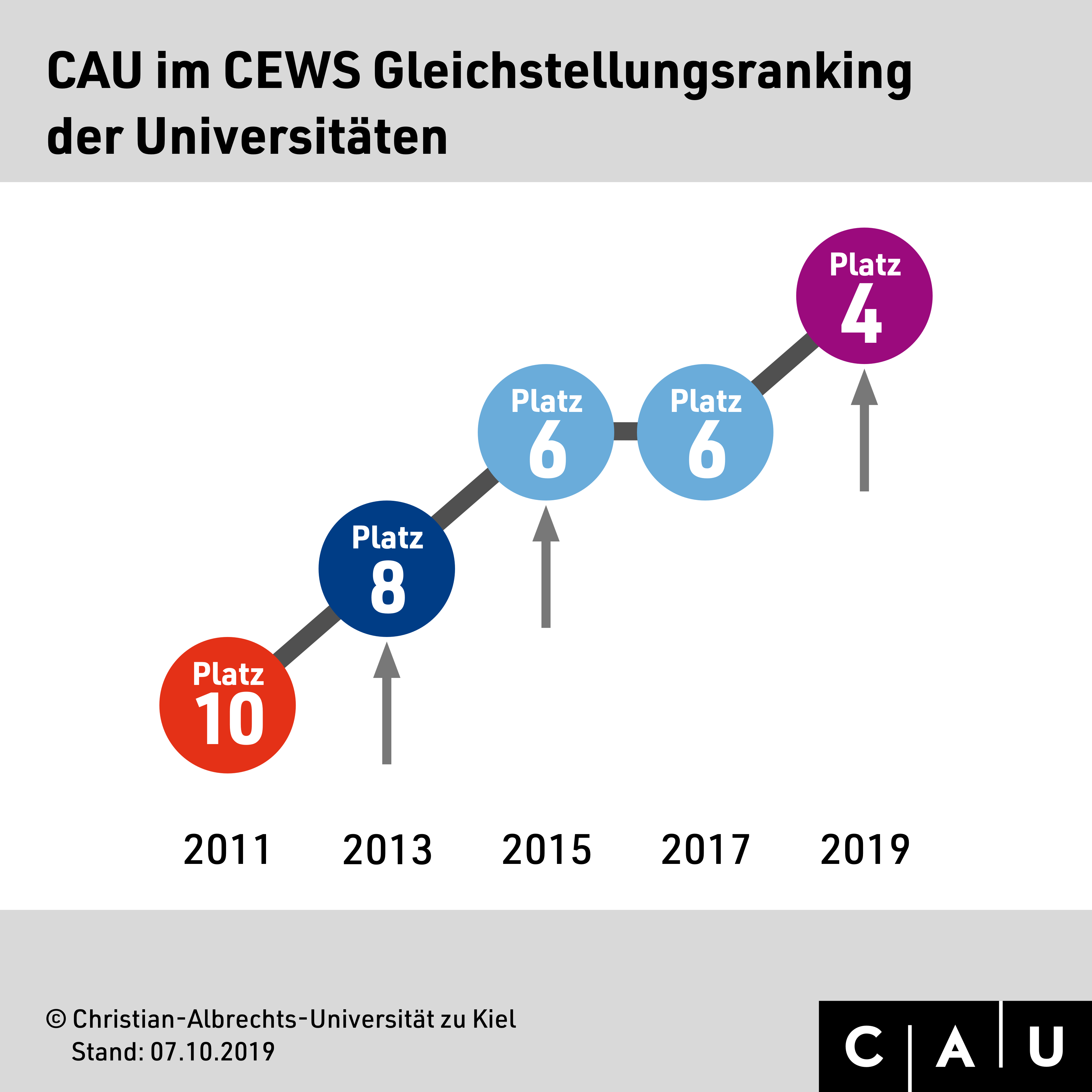 Der Christian-Albrechts-Universität zu Kiel (CAU) ist im aktuellen Gleichstellungs-Hochschulranking des GESIS – Leibniz-Institut für Sozialwissenschaften Köln zum ersten Mal der Sprung in die zweitbeste Ranggruppe geglückt. Bundesweit wurden nur noch drei Universitäten besser bewertet. Das Ranking des „Kompetenzzentrums Frauen in Wissenschaft und Forschung CEWS“ gilt als wichtiges Instrument der Qualitätssicherung für Gleichstellung an Hochschulen. Leistungen der Hochschulen bei der Gleichstellung von Frauen und Männern werden darin mithilfe quantitativer Indikatoren kontinuierlich und bundesweit verglichen. In das diesjährige Ranking sind die Daten von 292 Hochschulen eingeflossen; das Gesamtranking gibt Auskunft über 63 Universitäten, 134 Fachhochschulen und 44 Künstlerische Hochschulen.