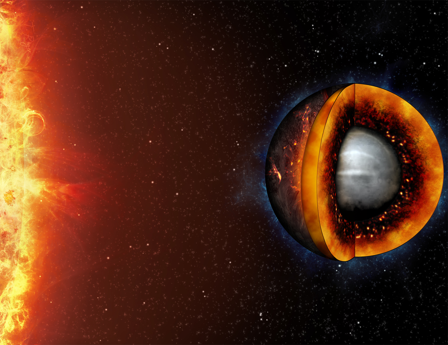 Gesteinsplaneten werden aus den Resten aller Resten gebildet. «Alles, was nicht in den Zentralstern oder einen Riesenplaneten gelangt, hat das Potenzial, einen viel kleineren, terrestrischen Planeten zu formen», sagt Bower: «Wir haben Grund zur Annahme, dass Prozesse während der Babyjahre eines Planeten für seinen späteren Lebensweg entscheidend sind.» Daher wollten Bower und ein Team von Post-Docs des Forschungsschwerpunkts PlanetS die beobachtbaren Charakteristiken eines solchen Planeten aufdecken. Ihre Studie ist nun in der Zeitschrift Astronomy & Astrophysics erschienen. Sie zeigt, dass eine geschmolzene Erde einen um etwa 5% grösseren Radius hätte als eine feste Erde. Denn unter den extremen Bedingungen im Planeteninneren verhält sich geschmolzenes Material anders als festes. «Im Wesentlichen nimmt ein geschmolzenes Silikat mehr Volumen ein als der entsprechende Festkörper, und das macht den Planeten grösser», erklärt Bower.