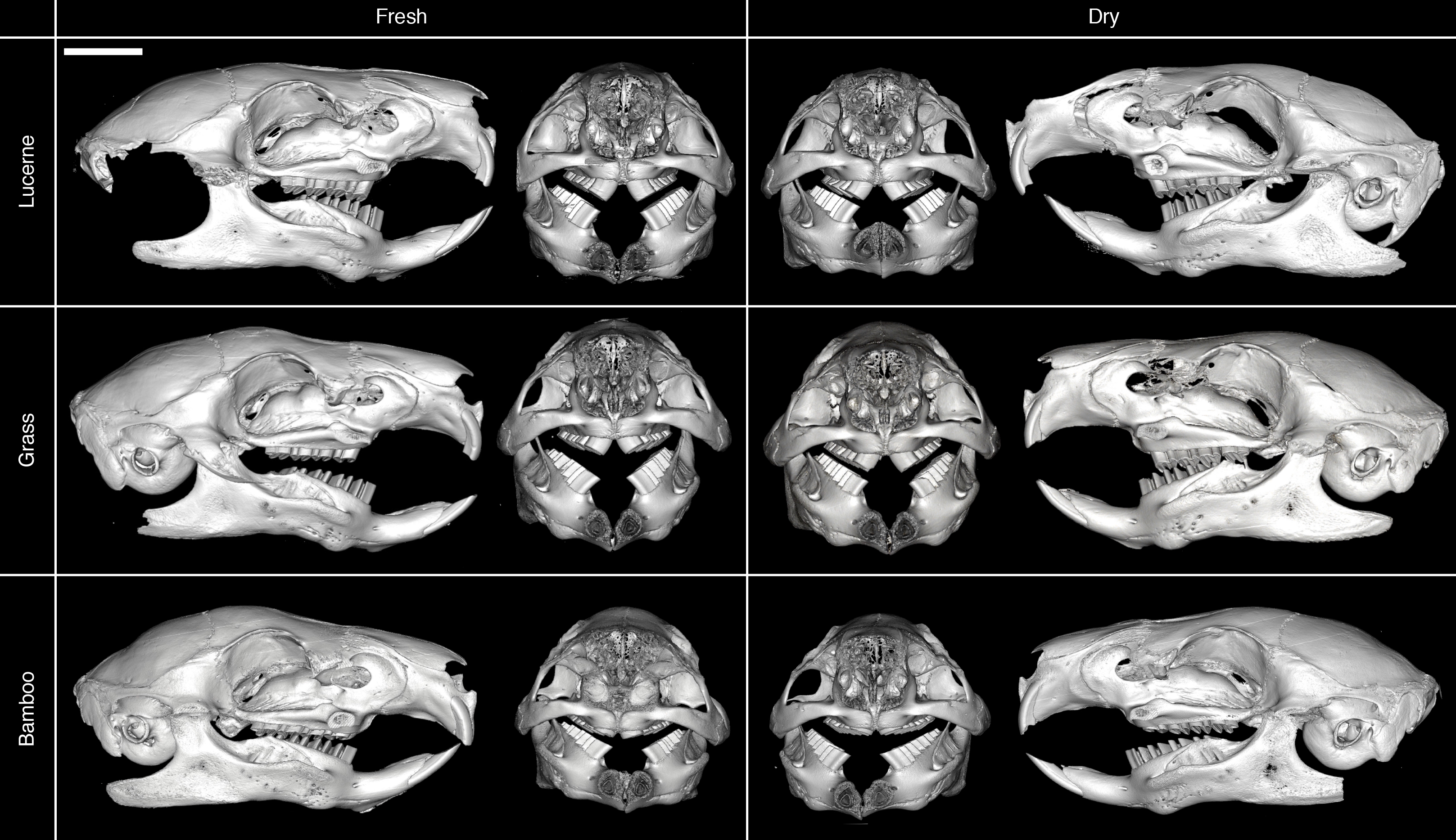 Die Ergebnisse haben die Forschenden selbst beeindruckt. «Auch ohne zu wissen, welches Tier ich gerade auf dem Bildschirm vermesse, konnte ich sagen, welches Futter es bekommen hatte», sagt Louise Martin, Doktorandin an der Zootierklinik. «Die bambusfressenden Tiere hatten deutlich kürzere Zähne.» Und das, obwohl bei Meerschweinchen auch die Backenzähne ständig nachwachsen. Bei genauem Hinschauen fand Martin das entscheidende Detail: Bei den kürzeren Zähnen waren die Dentin-Flächen überproportional ausgehöhlt. «Die Blattsteinchen greifen das Dentin an, und wenn die Schmelzleisten dann besonders weit hervorstehen, sind sie auch nicht mehr so stabil und werden selber abgerieben.» Ein Effekt, den man wohl nur in einem System mit rasch wachsenden Zähnen – wie bei Nagern – und ausserordentlich abschleifendem Futter wie Bambus so gut beobachten kann.