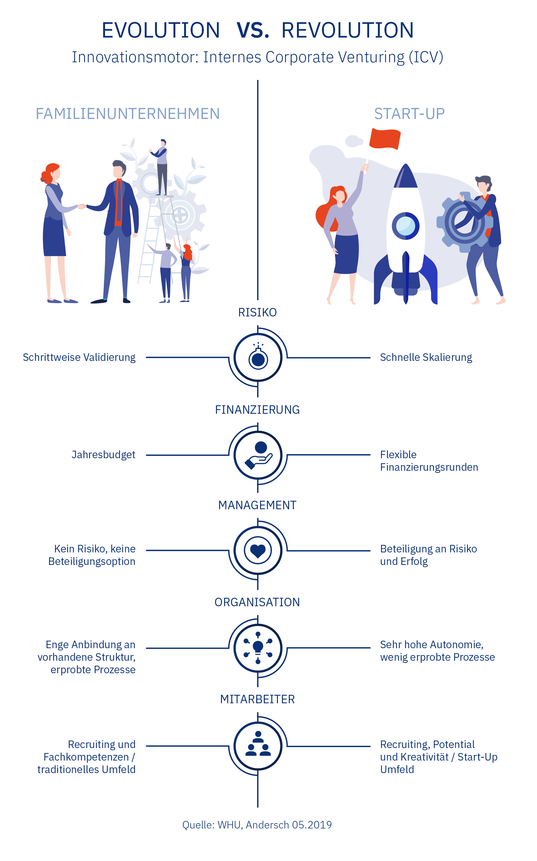 Die Untersuchung hat ergeben, dass Familienunternehmen in Aufbau, Entwicklung und Führung ihrer Organisationseinheiten für Innovation, Digitalisierung und Investition anders vorgehen als Konzerne und Start-ups. Das soll in der Folge verdeutlicht werden: