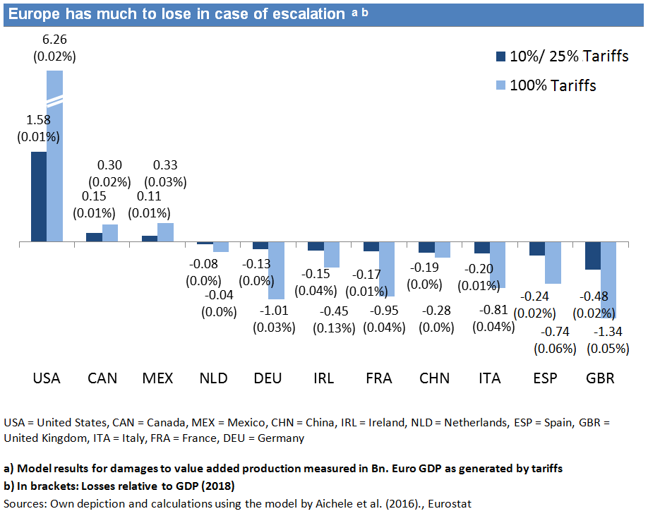 “All in all, the US administration stayed below its potential in terms of tariff levels following the WTO ruling. All the more serious is the demand from some sides that Europe should react immediately with countermeasures,” said Felbermayr. This could escalate the situation. “It is definitely more sensible to wait for the arbitration decision which the WTO will make in the parallel proceedings concerning Boeing next year. If the WTO then allows the EU to impose countervailing duties, Europe can also impose duties on American aircrafts. These alone would be a great threat for the USA, because Boeing sells considerably more aircraft in Europe than Airbus in the United States.”