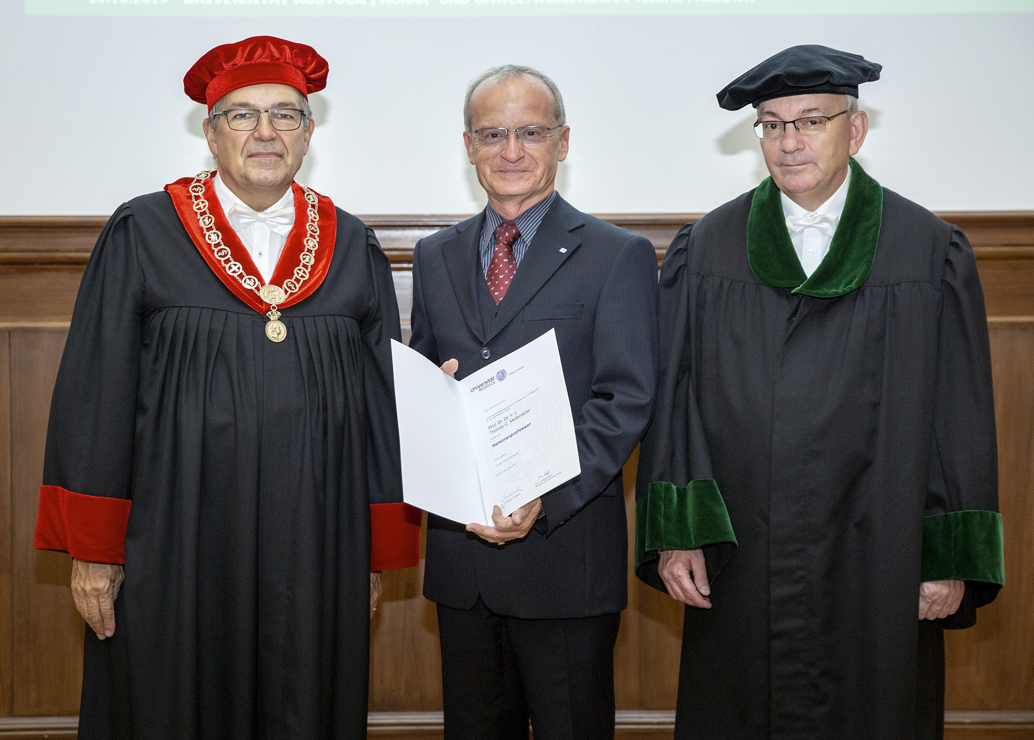 Bildunterschrift: (v.l.) Der Rektor der Universität Rostock Professor Wolfgang Schareck, Honorarprofessor Dr. Dr. h.c. Thomas C. Mettenleiter und der Dekan der Agrar- und Umweltwissenschaftlichen Fakultät Professor Konrad Miegel (Foto: Universität Rostock / ITMZ).