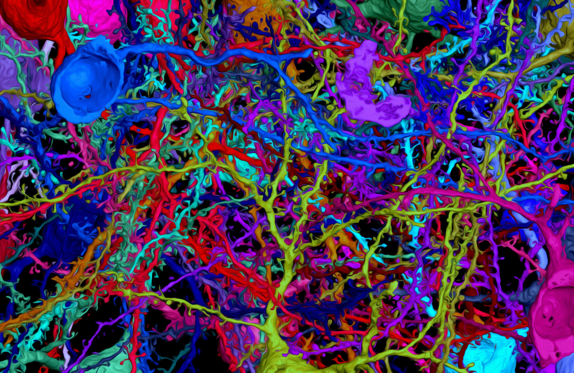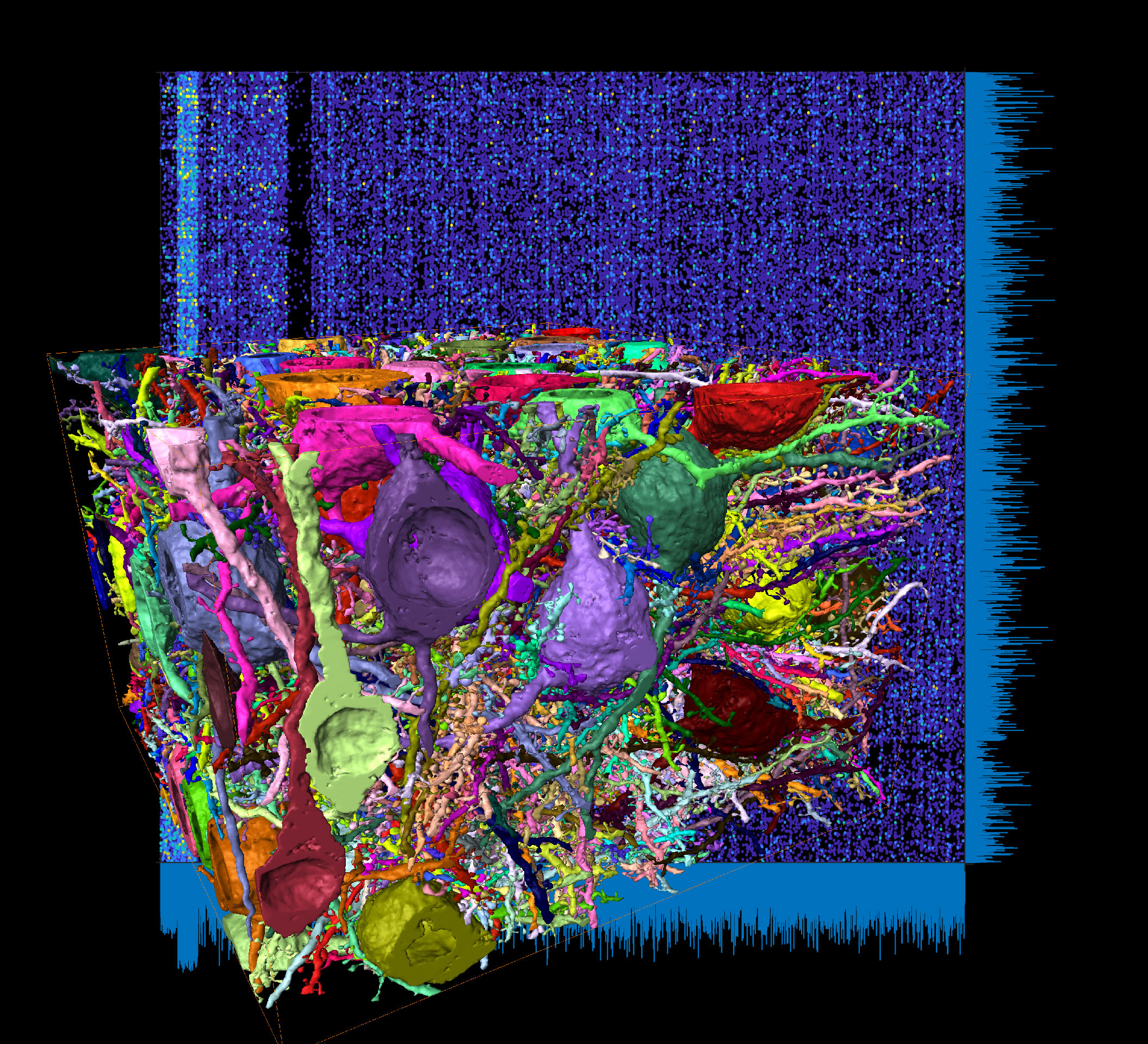 Unlike any other organ, our brains contain extremely densely packed networks of membranous cables that are used by our about 86 billion nerve cells for communication amongst each other. Since each nerve cell in the main part of mammalian brains, the so-called cerebral cortex, communicates with about 1,000 other nerve cells via synapses placed along these cables over long distances, one expects a total of about 5 million kilometers of wires packed into our skulls – more than 10 times longer than all highways on our planet, in each of our brains. The cables we find in our (and other mammalian) brains are as thin as 50 to 100 nanometers in diameter, about 1000th the diameter of our hairs. The resulting cable convolute is of such density and magnitude, that for more than 100 years, researchers have been able to only map connectivity between a miniscule fraction of neurons in a given piece of brain.