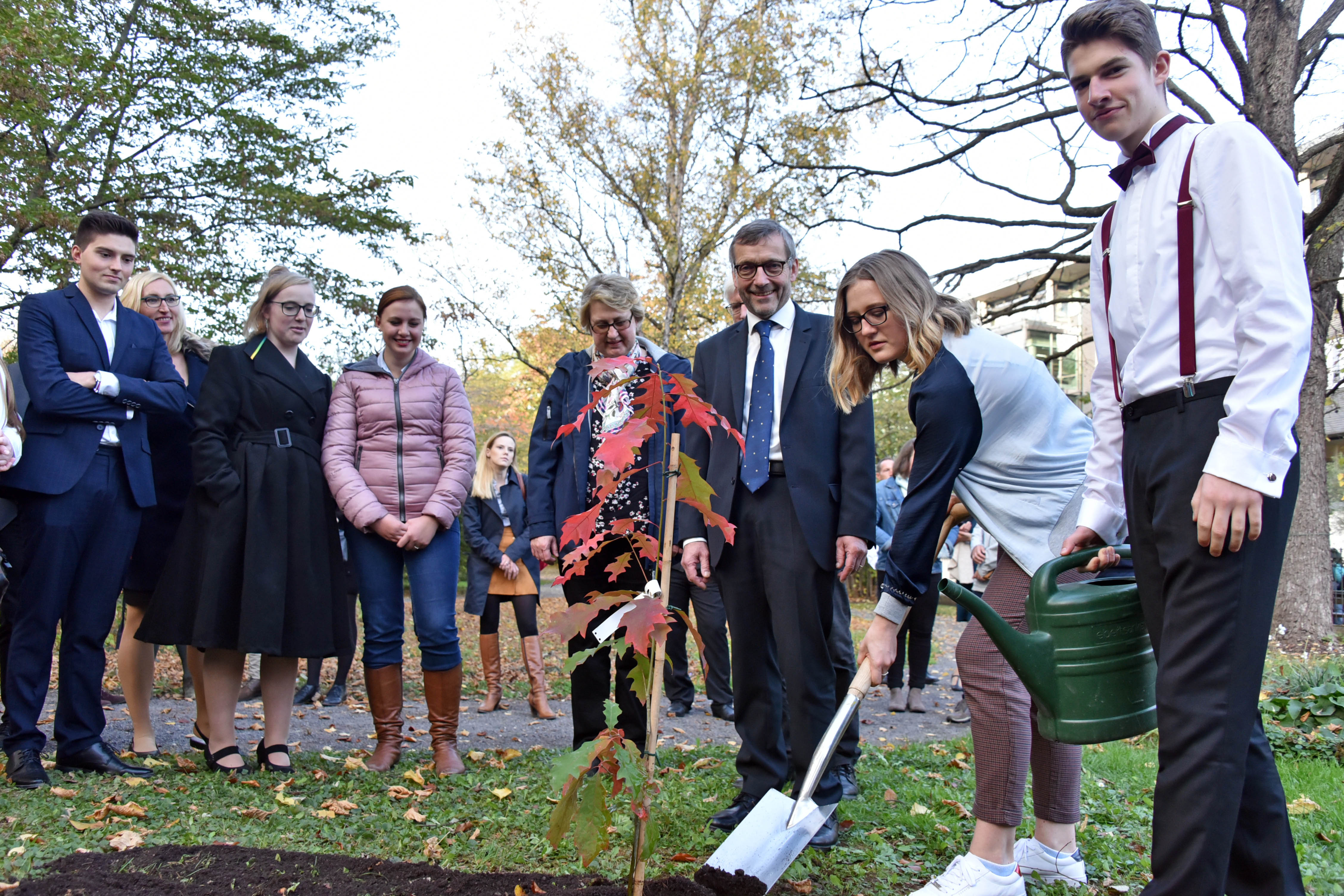 Gemeinsam mit Uni-Präsident Walter Rosenthal pflanzten die neuen Universitätsangehörigen im Anschluss eine nordamerikanische Roteiche im Botanischen Garten, die an die Matrikel 2019/20 erinnern wird. Die Universität Jena pflegt diese Tradition bereits seit 1993.