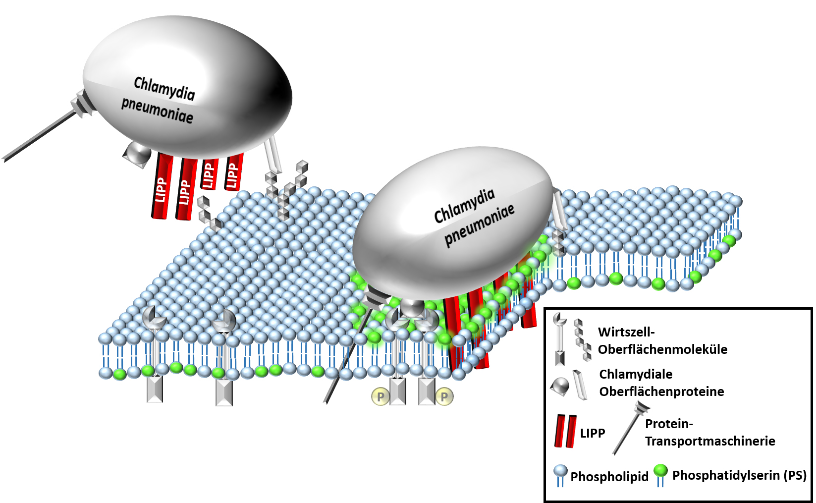 Dann aber transportiert das gebundene LIPP die sonst an der inneren Membranseite sitzenden PS-Moleküle nach außen. Mit LIPP wurde zum ersten Mal ein Protein identifiziert, welches bei Zugabe von außen einen Bestandteil der inneren Membranseite auf die Oberfläche der Zelle transportiert. Überraschenderweise löst dies nicht den Zelltod aus, sondern die Zelle ist weiterhin lebensfähig. Dies gilt sowohl für Zellen, die nur mit den LIPP-Proteinen allein konfrontiert sind, als auch für den Befall mit Chlamydien.