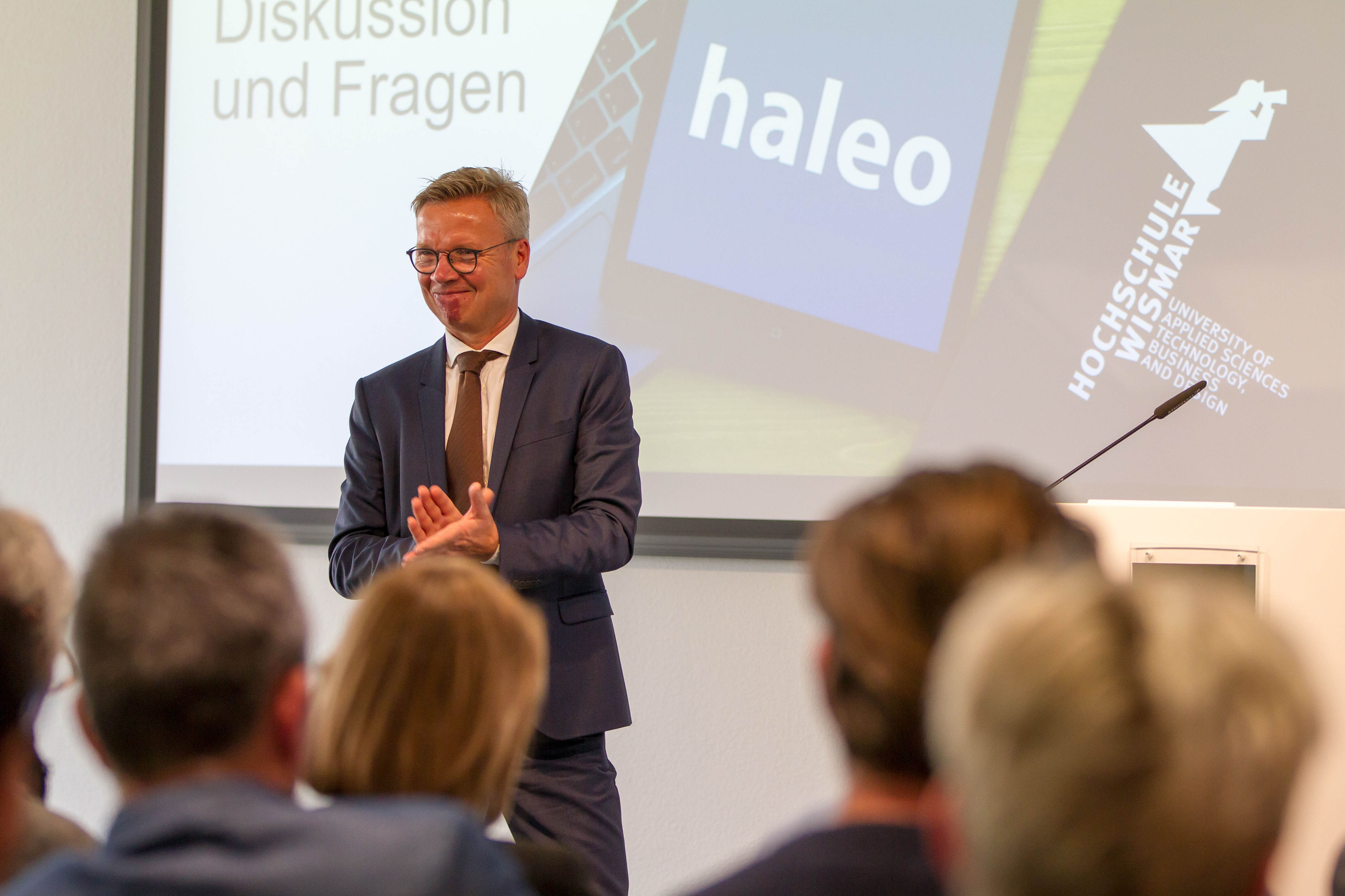„Handlungsorientiert lernen online", kurz: „haleo“, ist in vielerlei Hinsicht ein besonderes Projekt, nicht nur weil alle beteiligten Institutionen gemeinschaftlich am Erfolg des Projektes mitgewirkt haben. Hier wurden Konzepte entwickelt, um die an den Berufsschulen vorherrschende Didaktik ins Digitale zu übertragen. Es wirkten Partner aus allen Bereichen der beruflichen Bildung zusammen: das Bildungsministerium, die Schulträger, die Industrie- und Handelskammern, die Handwerkskammer, einige exemplarische Betriebe und natürlich die beruflichen Schulen. Von allen betont wurde die beispiellos gute Zusammenarbeit aller Beteiligter. Ellen Grull von der IHK Neubrandenburg sagte zum Beispiel, dass haleo die beste Lernkooperation sei, die sie in 28 Jahren erlebt habe. Mehrfach wurde während der Diskussionsrunde der Wunsch nach Verstetigung formuliert, aufbauend auf den Ergebnissen und Erfahrungen. Projektleiter Jörg Seemann blickte in seiner Rede zufrieden auf die beiden vergangenen Projektphasen zurück und bedankte sich bei allen Mitwirkenden. Ein besonderer Dank ging an die Mitarbeiterinnen des E-Learning-Zentrums der Hochschule Wismar, die die Lernplattform betrieben, die Lehrkräfte unterstützten sowie die wissenschaftliche Evaluation des Projektes durchführten und ausgewerteten.