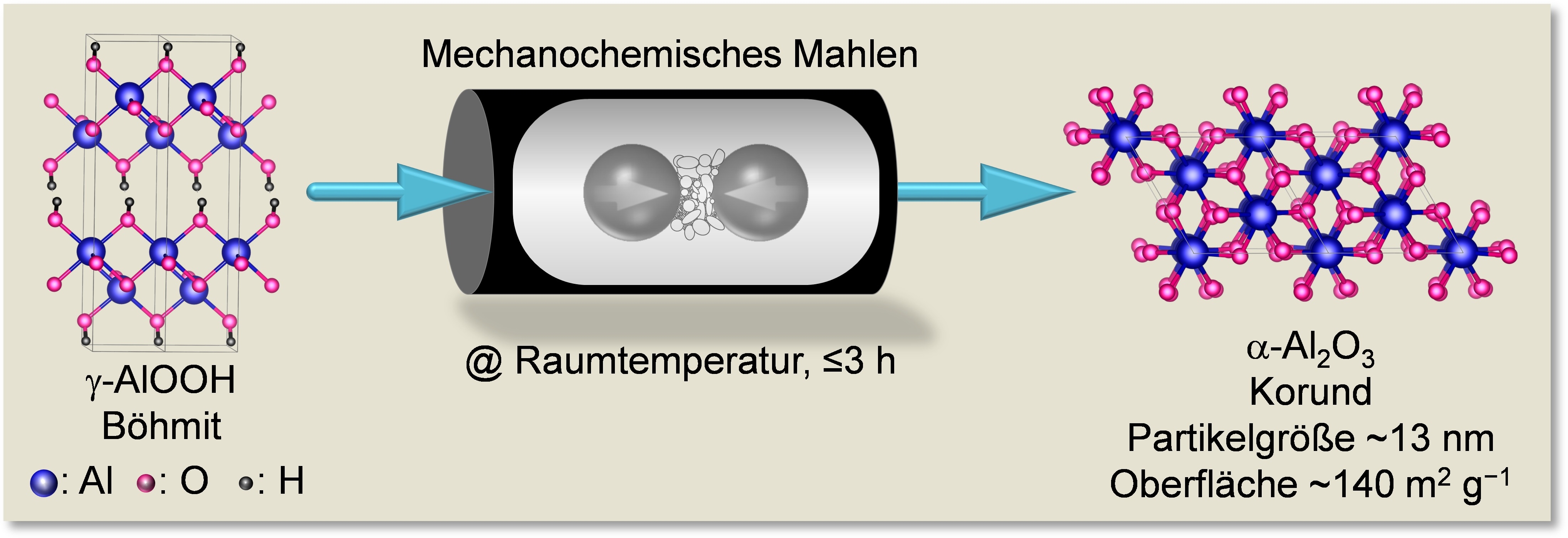 Inzwischen können die Chemiker auch erklären, warum ein so banaler Vorgang wie das Mahlen eine Route zu einem Mineral eröffnet, das sonst nur unter harschen Bedingungen und schon gar nicht in Nanoform zu bekommen ist. Zum einen beeinträchtigen die Defekte wie Risse, Brüche und Stufen, die beim Mahlen entstehen, die Stabilität von Korund weniger als die von weicheren Aluminiumoxiden. Korund entsteht deshalb bevorzugt. Zum anderen liefern die Stöße, die das Material in der Mühle erfährt, genau die mechanische Energie, die für den ziemlich aufwendigen Umbau der Kristallstruktur zum Korund nötig ist. Die vergleichsweise niedrigen Temperaturen bei dem Prozess verhindern zudem, dass sich die Nanoteilchen zu größeren Körnern verklumpen.
