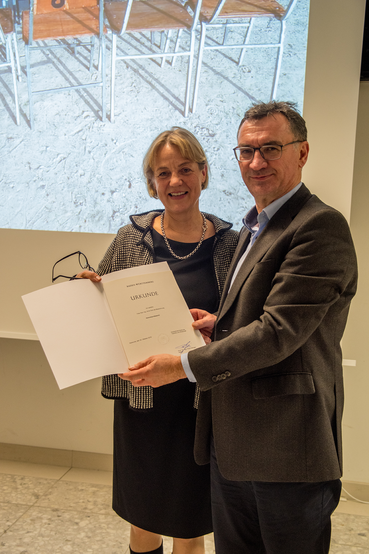 In einem Festakt am gestrigen Mittwoch, 30. Oktober 2019, wurde Dipl.-Ing. Anne Sick, Leiterin des Karlsruher Amts für Hochbau und Gebäudemanagement der Stadt Karlsruhe, von Prof. Dr. Franz Quint, Prorektor für Forschung, Kooperationen und Qualitätsmanagement, zur Honorarprofessorin der Hochschule Karlsruhe – Technik und Wirtschaft ernannt. Die Hochschule würdigt damit ihre herausragenden Leistungen und ihr langjähriges Engagement für die Hochschule und ihre Studierenden.