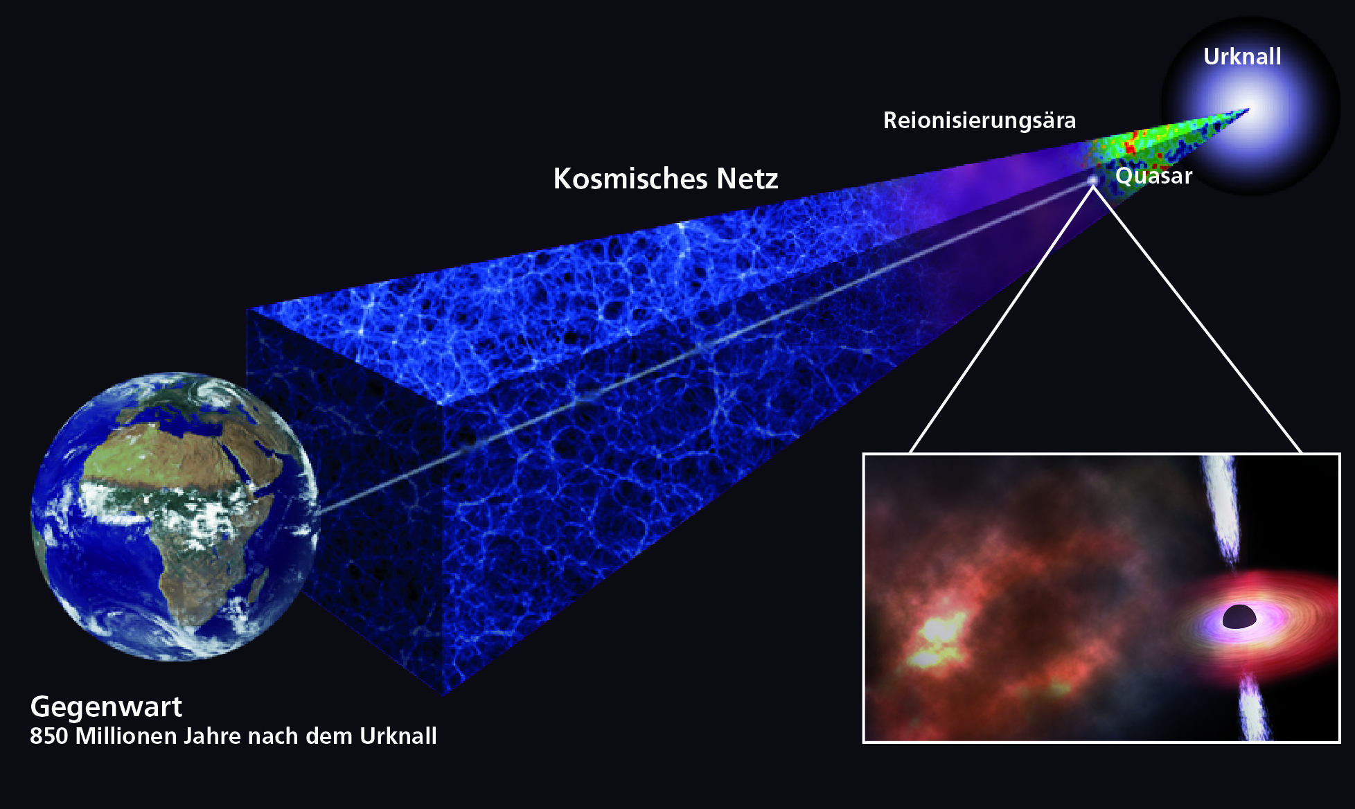 Wenn Astronomen ferne Himmelsobjekte beobachten, dann blicken sie zwangsläufig in die Vergangenheit zurück. Die von Bañados et al. entdeckte Gaswolke ist so weit entfernt, dass ihr Licht fast 13 Milliarden Jahre gebraucht hat, um uns zu erreichen. Dementsprechend zeigt uns das Licht, das uns jetzt erreicht, wie die Gaswolke vor fast 13 Milliarden Jahren aussah, nicht mehr als etwa 850 Millionen Jahre nach dem Urknall. Für Astronomen ist jene Zeit besonders interessant, innerhalb der ersten mehreren hundert Millionen Jahre nach dem Urknall bildeten sich die ersten Sterne und Galaxien – und die Details dieser frühen Entwicklung sind noch weitgehend unbekannt.
