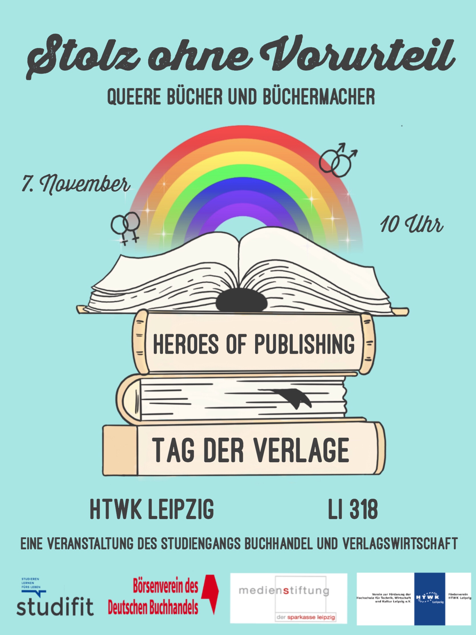 Am 7. November 2019 lädt der Studiengang Buchhandel/Verlagswirtschaft der Hochschule für Technik, Wirtschaft und Kultur Leipzig (HTWK Leipzig) zu dieser Veranstaltung ein. Von 10 bis 15 Uhr können Interessierte an der HTWK (Lipsius-Bau, Karl-Liebknecht-Straße 145, Hörsaal 318) mehr über die Arbeit und den Alltag unabhängiger Verlage erfahren, denen bei dieser Veranstaltung alljährlich eine Plattform geboten wird. Branchenvertreterinnen und -vertreter aus verschiedenen Verlagen und Gäste diskutieren außerdem zum Thema „Stolz ohne Vorurteil – Queere Bücher und Büchermacher“. Der Eintritt ist frei.