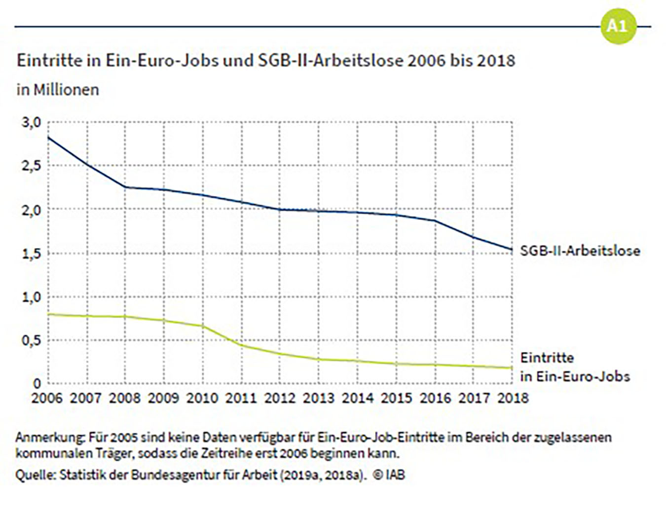 Bereits ab dem Jahr 2010 ist die Zahl der Ein-Euro-Jobs stark gesunken. Während 2018 die Zahl der begonnenen Ein-Euro-Jobs bei 184.000 lag, gab es bis einschließlich 2009 noch mehr als 700.000. Die Reform der arbeitsmarktpolitischen Instrumente im Jahr 2012 hat den Einsatz von Ein-Euro-Jobs weiter eingeschränkt. „Seither wird die eigentliche Zielgruppe besser erreicht als zuvor“, stellen die Arbeitsmarktforscher fest.