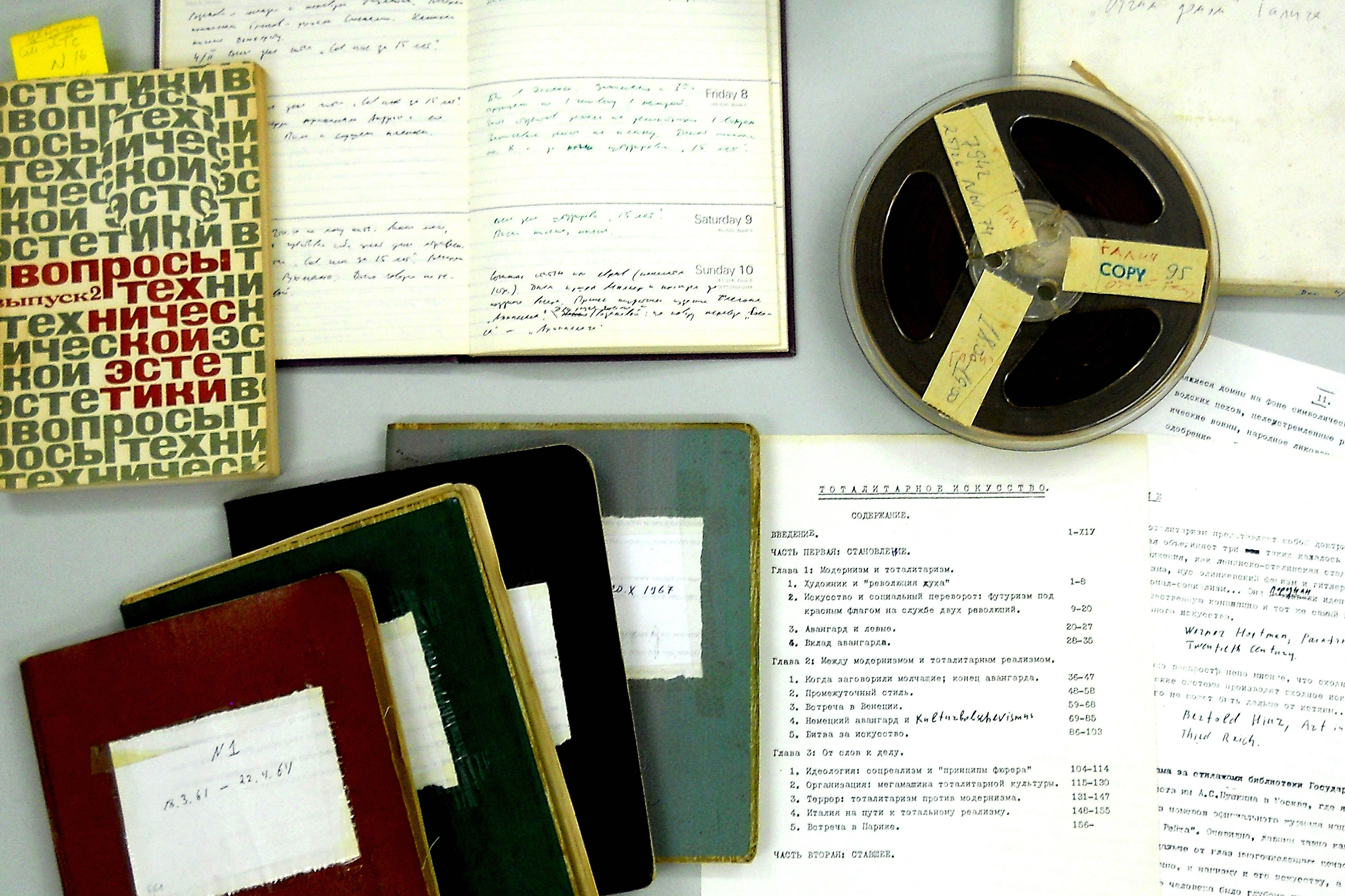 Unter den zusammengeführten Archivmaterialien finden sich Briefwechsel, Werke und seltene Ausstellungskataloge namhafter Konzept- und Performance-Künstlerinnen und -Künstler wie Ry Nikonova, Dmitri Prigov, Ilya Kabakov und Andrei Monastyrski, aber auch die Papiere des Kunsttheoretikers Igor Golomstock, der erst im Untergrund und dann im Londoner Exil Schriften über Kunst im Totalitarismus verfasste.