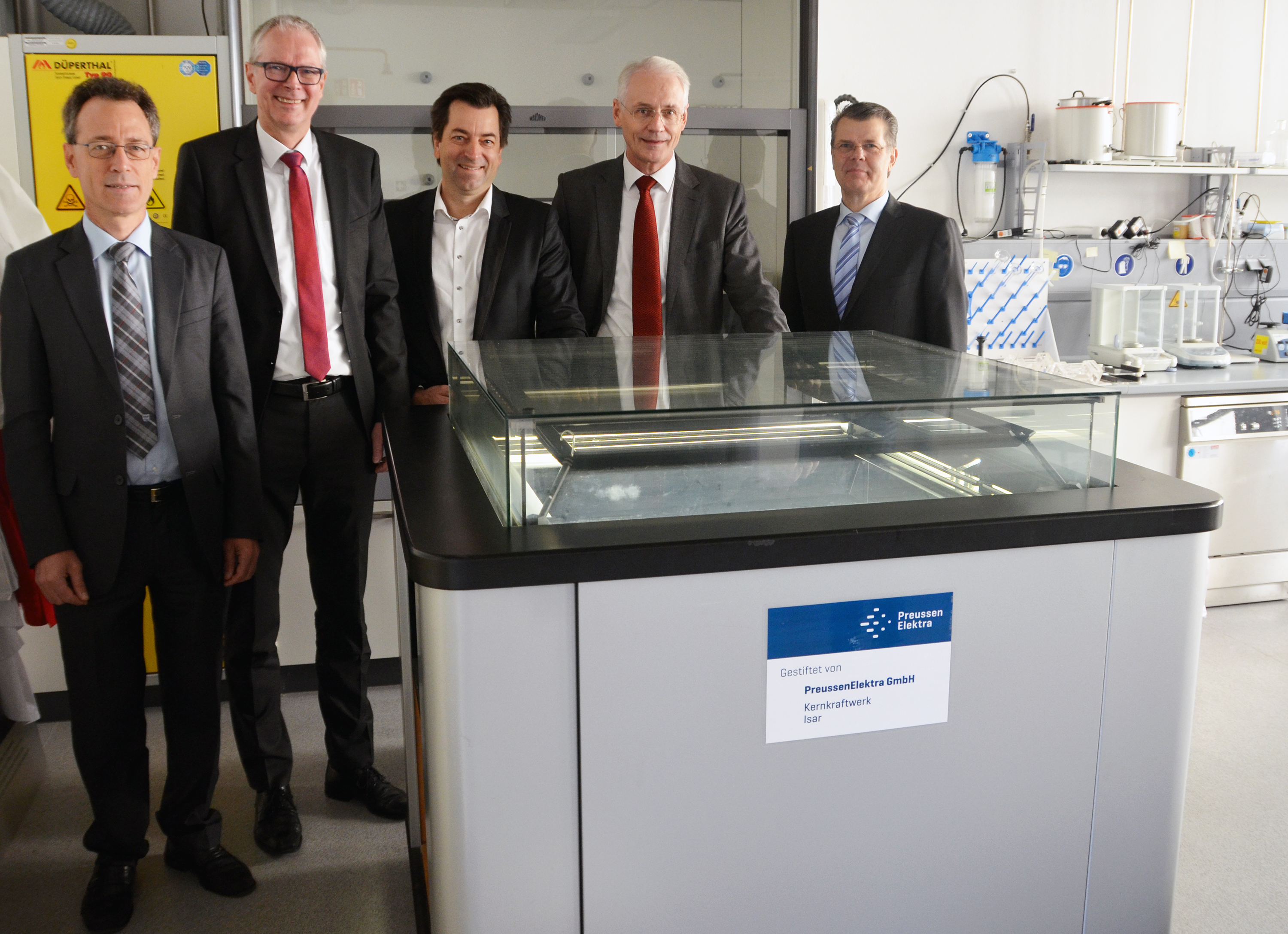 Der Hochschule Landshut ist ein absoluter Coup gelungen. Studierende haben künftig die Möglichkeit, in einer Diffusions-Nebelkammer natürlich ionisierende Strahlung sichtbar zu machen. Bisher stand die Nebelkammer im Informationszentrum des Kernkraftwerks Isar (KKI) und wurde für die Besucherbetreuung genutzt. Aufgrund räumlicher Umstrukturierungen wird sie dort aber nicht mehr benötigt. Zur offiziellen Übergabe in einem der Hochschul-Labore kamen Hochschulpräsident Prof. Dr. Karl Stoffel, KKI-Standortleiter Carsten Müller, Bernd Gulich von der Kommunikationsabteilung des KKI, der Dekan der Fakultät Elektrotechnik und Wirtschaftsingenieurwesen Prof. Dr. Fritz Pörnbacher sowie der Studiengangleiter des Masters Prozessmanagement und Ressourceneffizienz Prof. Dr. Stefan-Alexander Arlt zusammen.