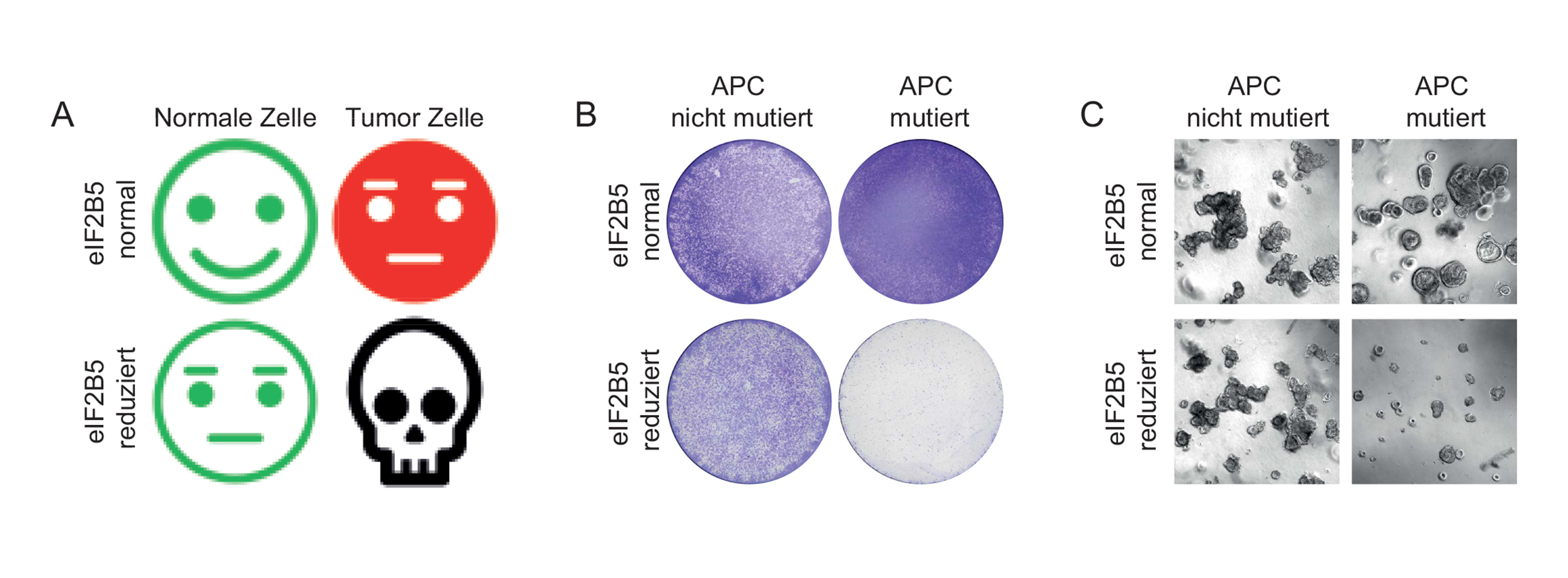 Die Suche nach der Nadel im Heuhaufen hatte Erfolg. Das berichten die Forschungsteams jetzt im Fachjournal Nature Cell Biology: Hemmten sie das Gen mit dem Namen eIF2B5, dann starben die mutierten Darmkrebszellen den sogenannten programmierten Zelltod – das ist ein Selbstzerstörungsprogramm, mit dem der Organismus im Normalfall beschädigte oder gealterte Zellen entsorgt. Gesunde Zellen dagegen verkrafteten die Hemmung des Gens ohne jegliche Beeinträchtigung.