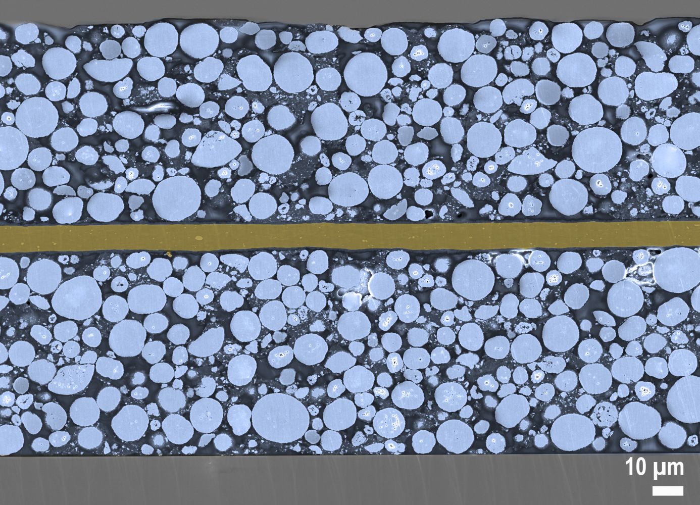 To achieve this, the researchers are developing new materials, design principles and processing technologies for the electrodes in the smallest energy storage units of an accumulator. Important components in such a cell are the anode and cathode. The electrical charge carriers move back and forth between these two poles when a battery is charged or when it is supplying electricity for the electric motor in an electric car. Today, the anode in a lithium-ion battery usually consists of a copper conductor a few micrometers (thousandths of a millimeter) thin, covered with a graphite layer about 100 micrometers thick.