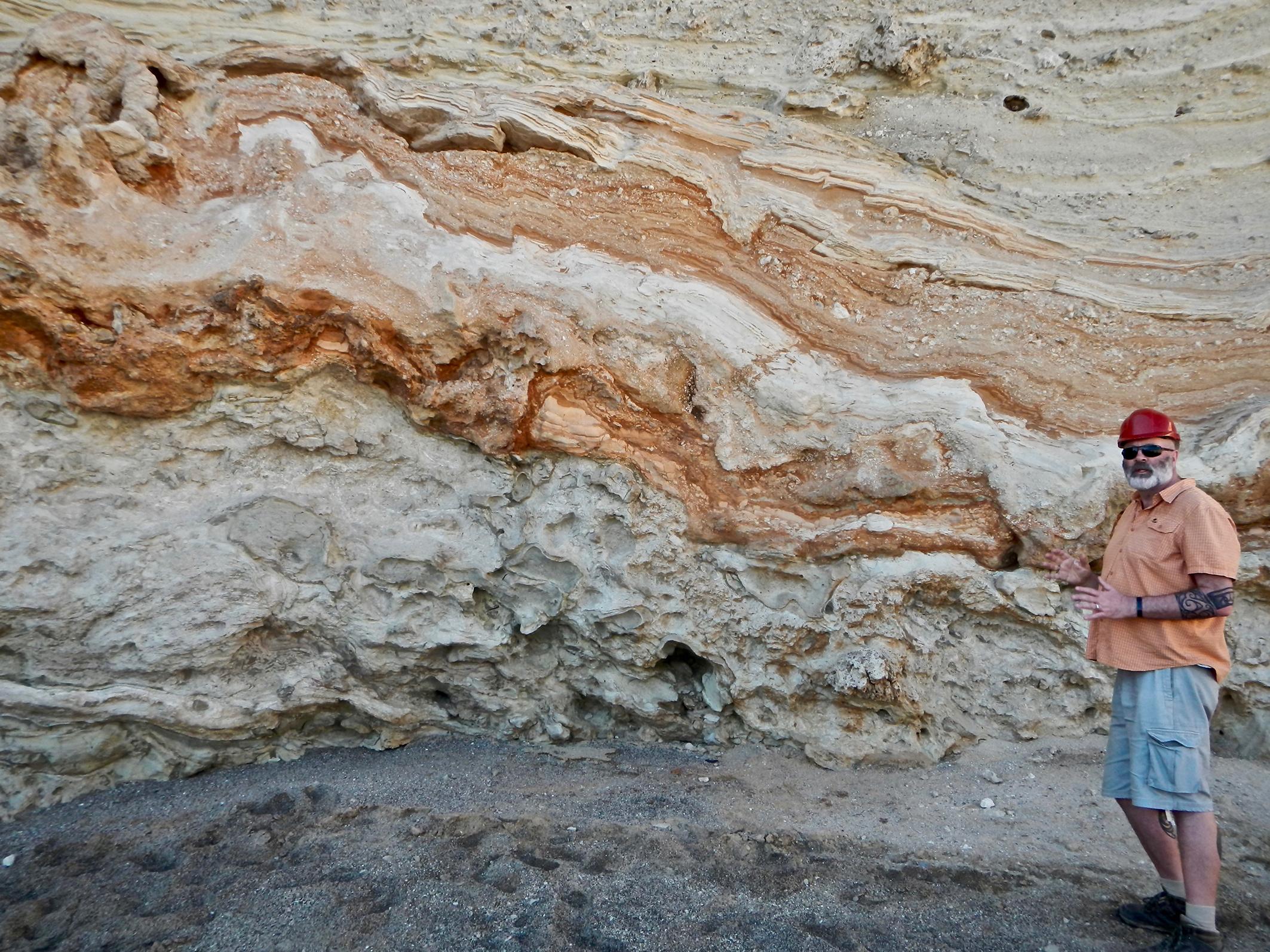 Wer die Augen offen hält, wird Bemerkenswertes entdecken und mit dem Taschenführer einordnen können: zum Beispiel „Rippel“. Die Strömung hinterlässt diese wellenartigen Oberflächenformen am Sandstrand eines Sees oder Meeres. Solche Strukturen sind auch in Sedimentgesteinen „konserviert“. Wer sich damit genauer auseinandersetzt, kann auf die Herkunft solcher Gesteine schließen. „Für alle Erscheinungsformen gibt es einen Grund“, sagt der Sedimentologe und deutet auf eine flache Steinplatte, in der solche Rippel deutlich zu erkennen sind. Auffallend sind kleine „Pocken“ in der gewellten Oberfläche. McCann: „Die haben Regentropfen hinterlassen, als sie vor rund 80 Millionen Jahren auf die Rippel schlugen.“