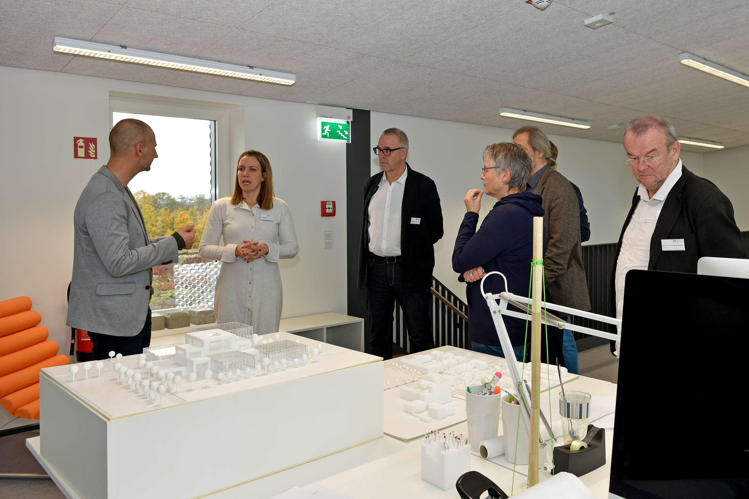 Auch die besondere räumliche Gestaltung und strukturelle Verflechtung des großen studentischen Arbeitsbereiches mit den Büroarbeitsplätzen der wissenschaftlichen Mitarbeitenden, welche auf einer offenen Galerie über den Plätzen der Studierenden organisiert sind, stieß auf Interesse: „Das fördert sicherlich den Austausch unter den Studierenden und Mitarbeitenden. Und den Geräuschpegel durch die vielen Studierenden unten habe ich hier oben höher erwartet“, merkte Prof. Stephanie Kaindl von der Fachhochschule Erfurt bei der Führung an.